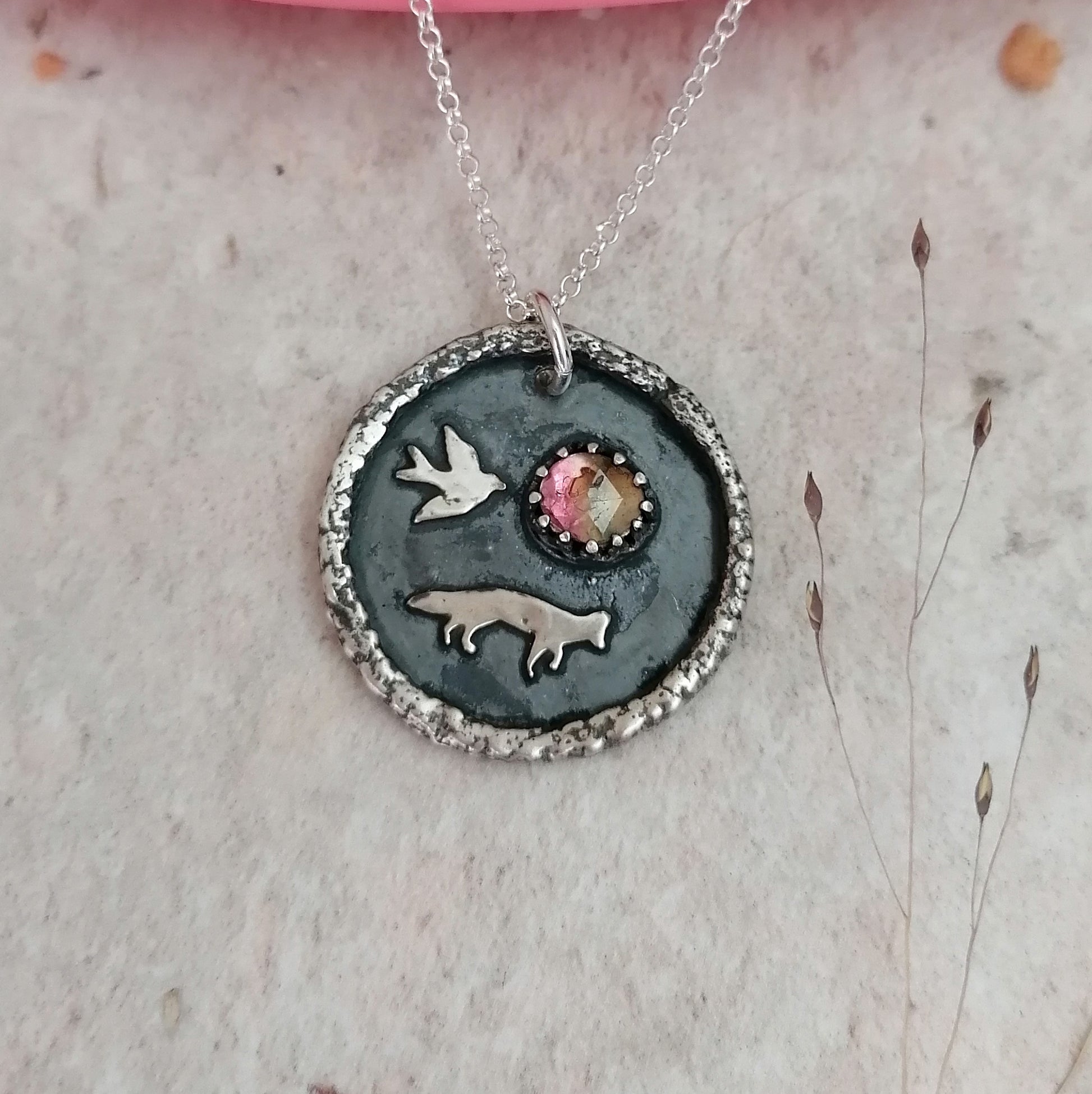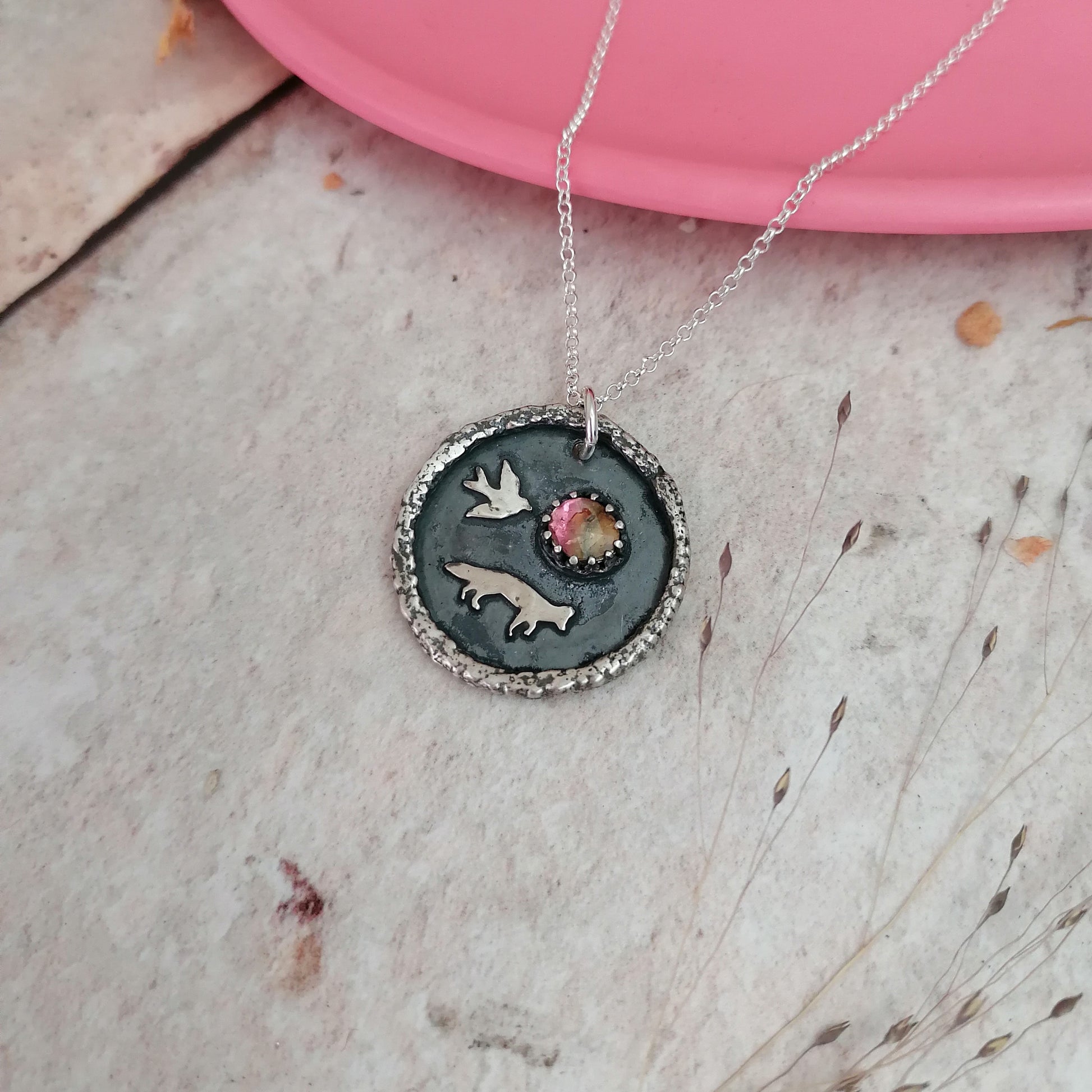 Beautiful pendant made from recycled sterling silver featuring a lovely fox and bird and stunning watermelon tourmaline gemstone. The pendant has a frame resembling tree branches which has been handmade from recycled sterling silver wire The pendant measures approximately 22mm and hangs from an 18" sterling silver belcher chain.