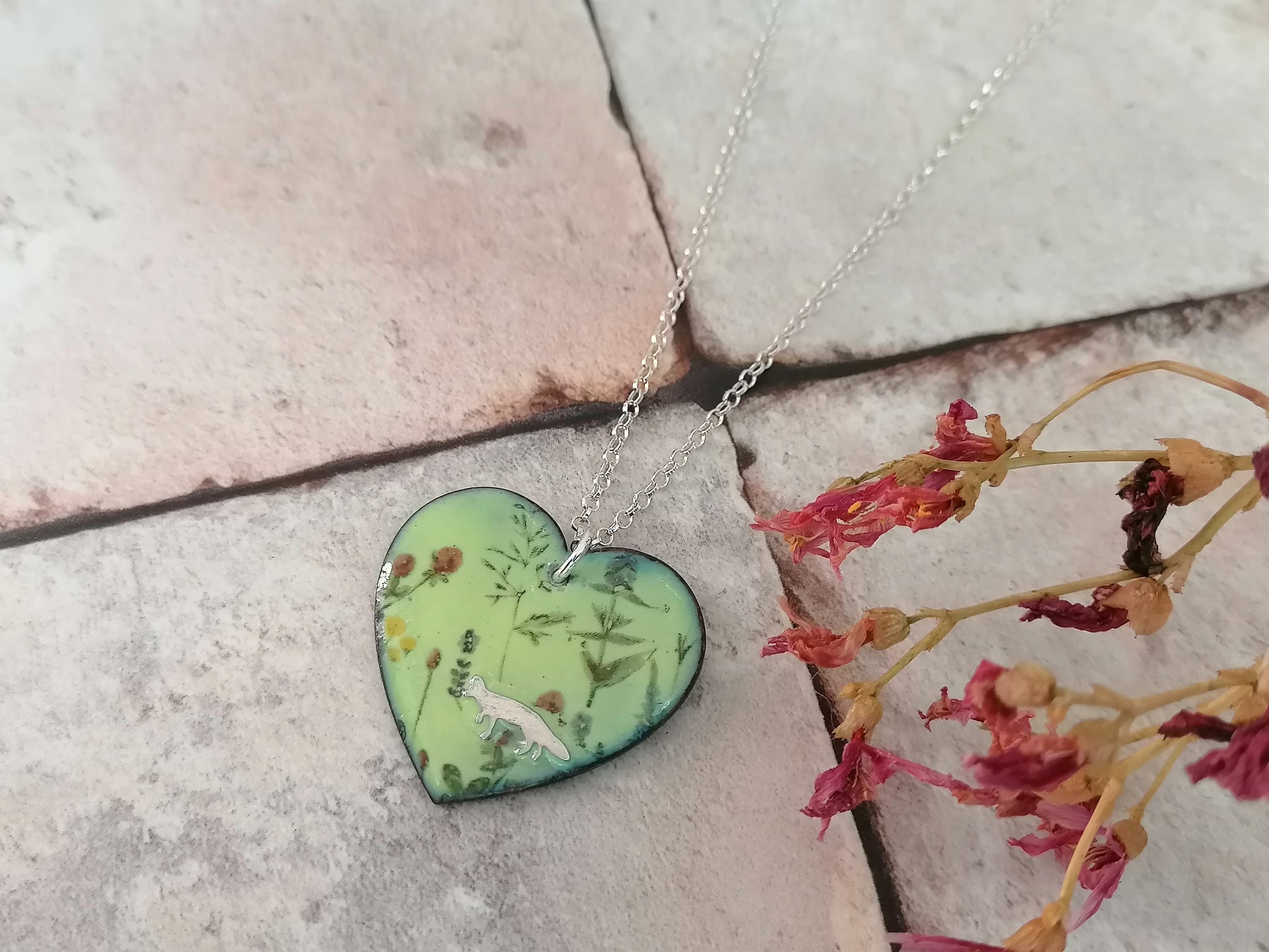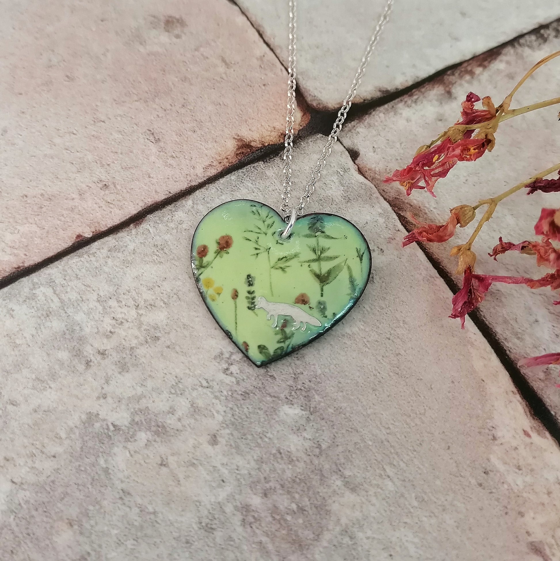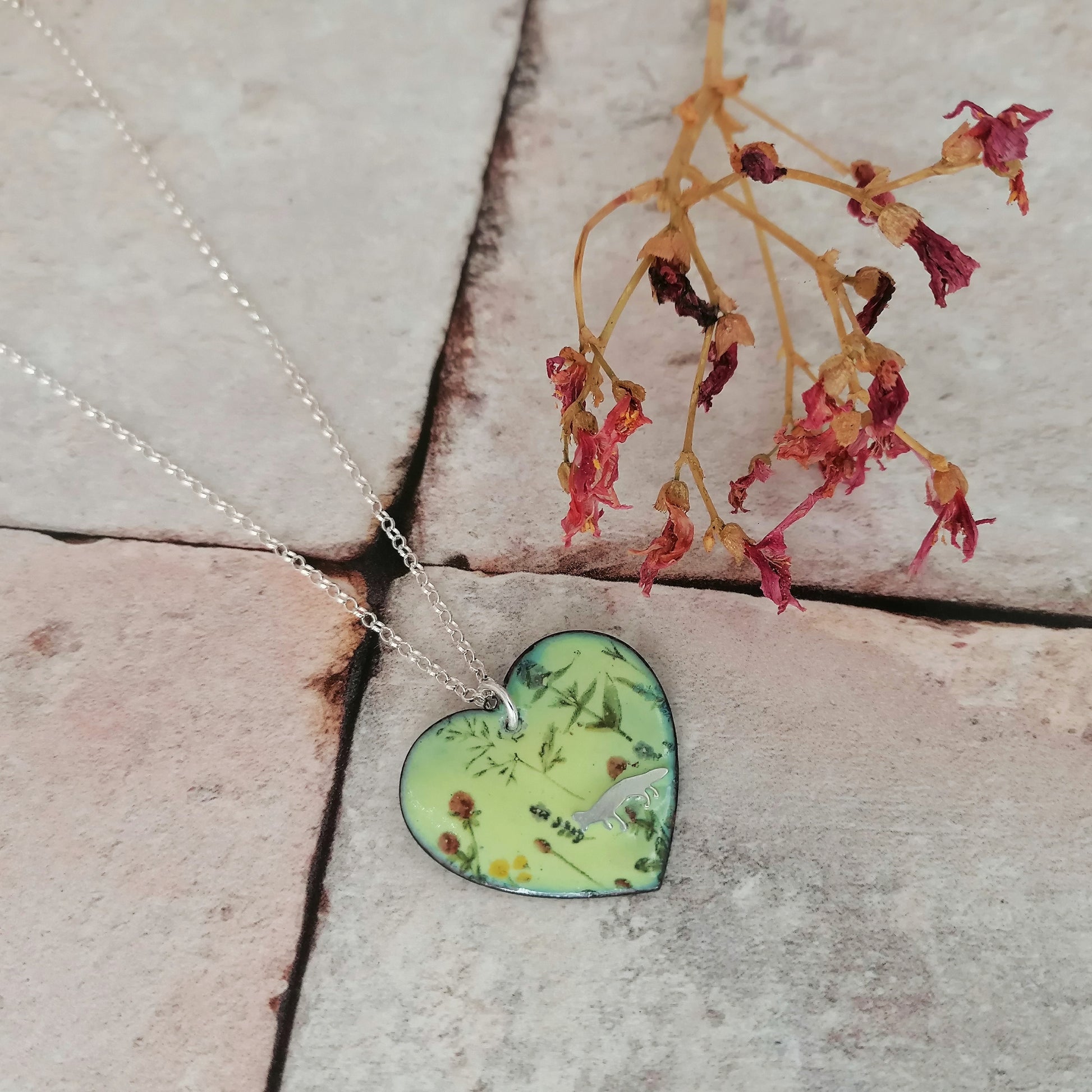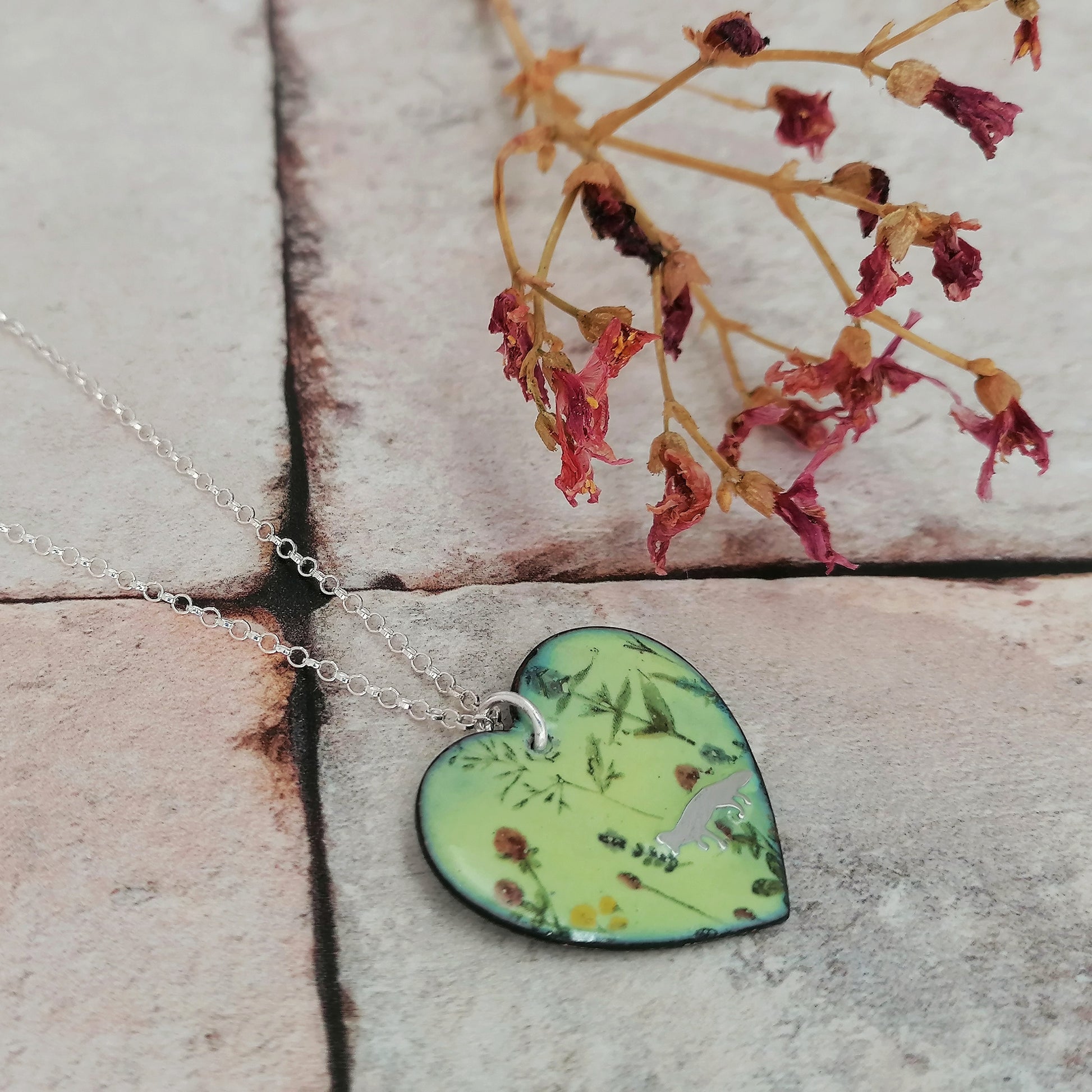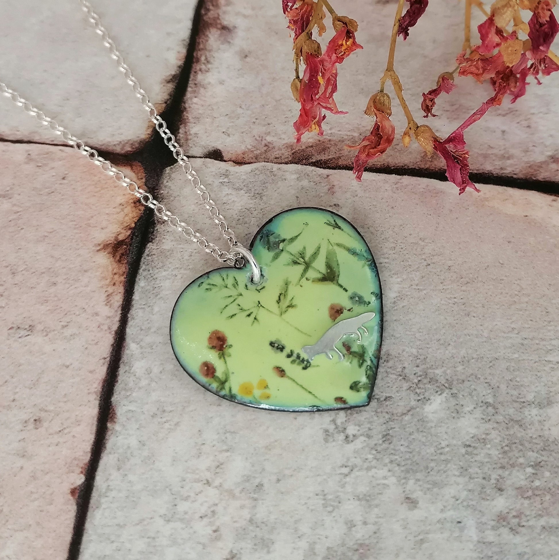 Such a pretty heart shaped necklace featuring a stunning little silver fox nestled amongst the wildflowers. The pendant is made from copper and enamelled on both sides. The front side is a beautiful spring green and the back is a bluey grey colour. The heart measures approximately 30mm x 29mm and hangs from an 18" sterling silver belcher chain.