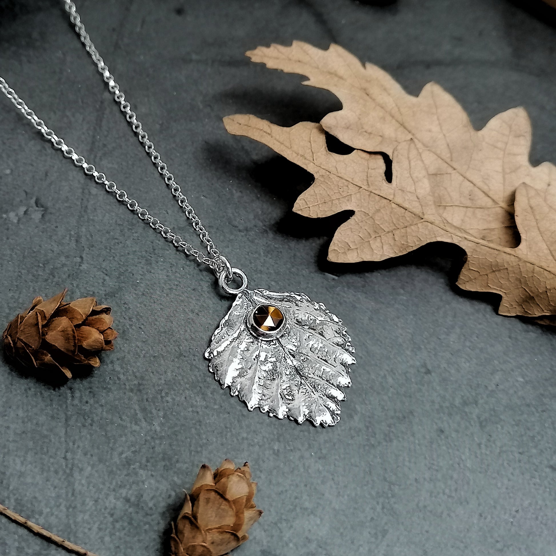 This is an absolutely beautiful necklace featuring a real beech leaf encapsulated in fine silver. This one of a kind pendant is accentuated by a rose cut tiger eye gemstone. This stunning pendant hangs from an 18" sterling silver belcher chain.