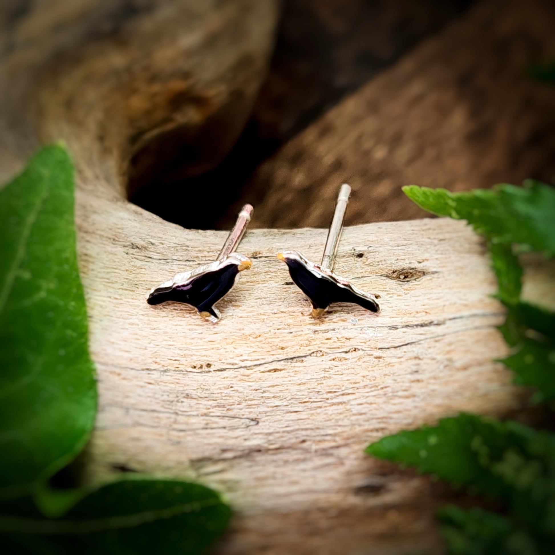 Super cute hand painted blackbird stud earrings. The blackbirds have been handmade from recycled silver and carefully hand painted. They are supplied with push on backs.