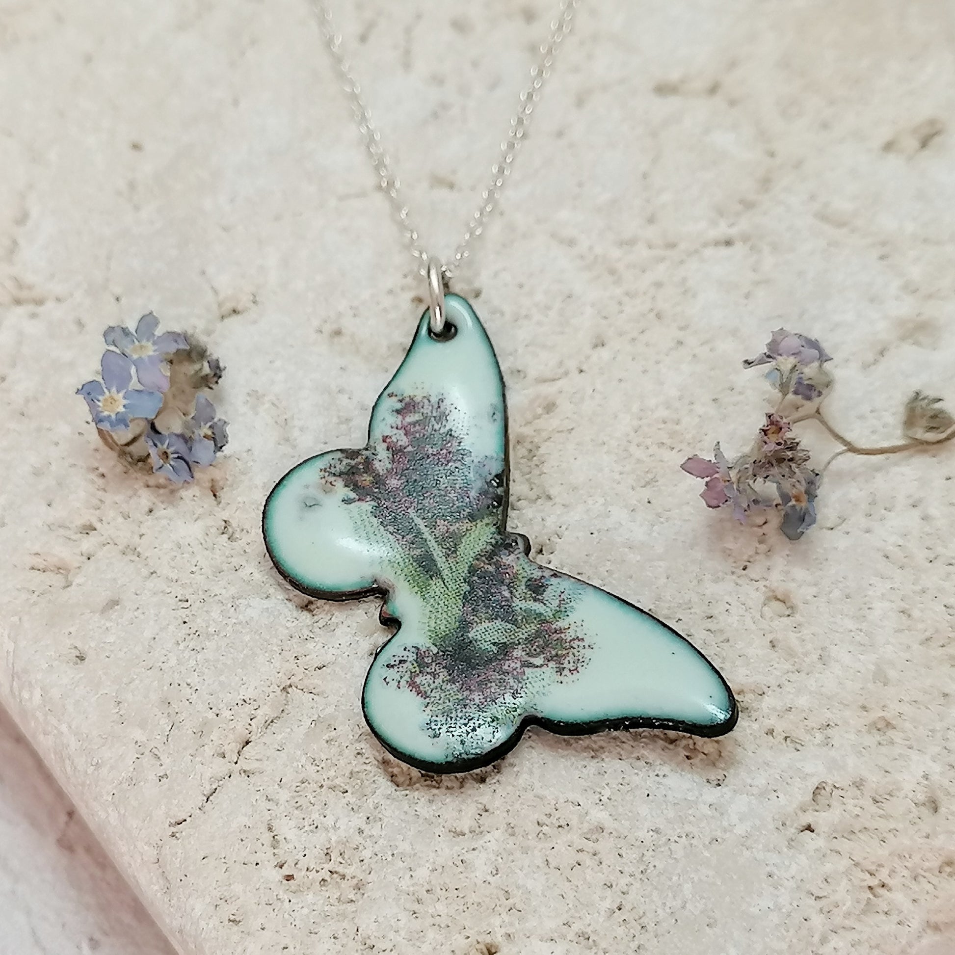 Pretty enamel butterfly necklace featuring a lavender flower pattern. The butterfly is made from copper which has been enamelled on both sides. The back of the pendant is enamelled with a grey/blue coloured counter enamel and the front is a pretty ivory colour with a lavender flower pattern. This hangs from an 18" sterling silver belcher chain.
