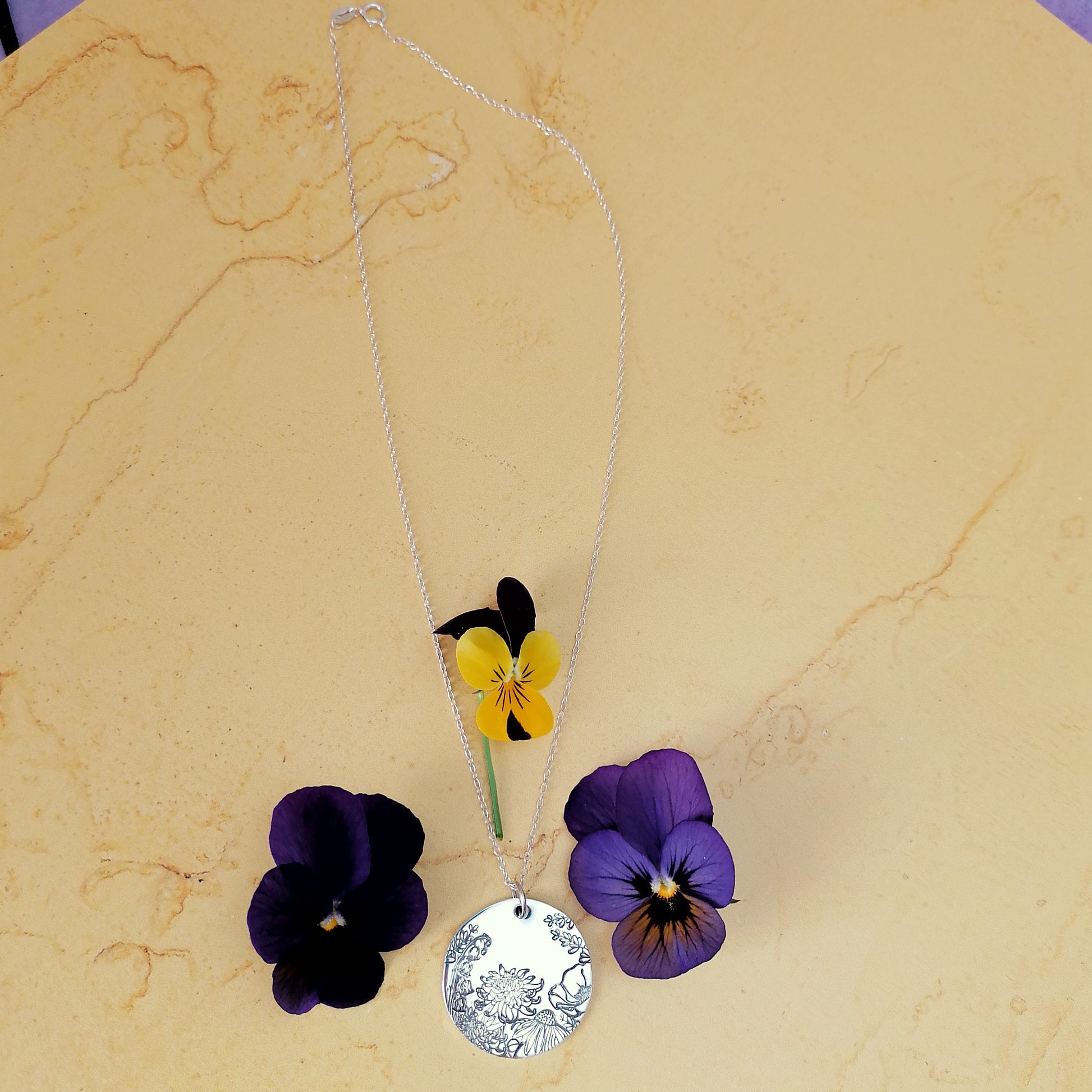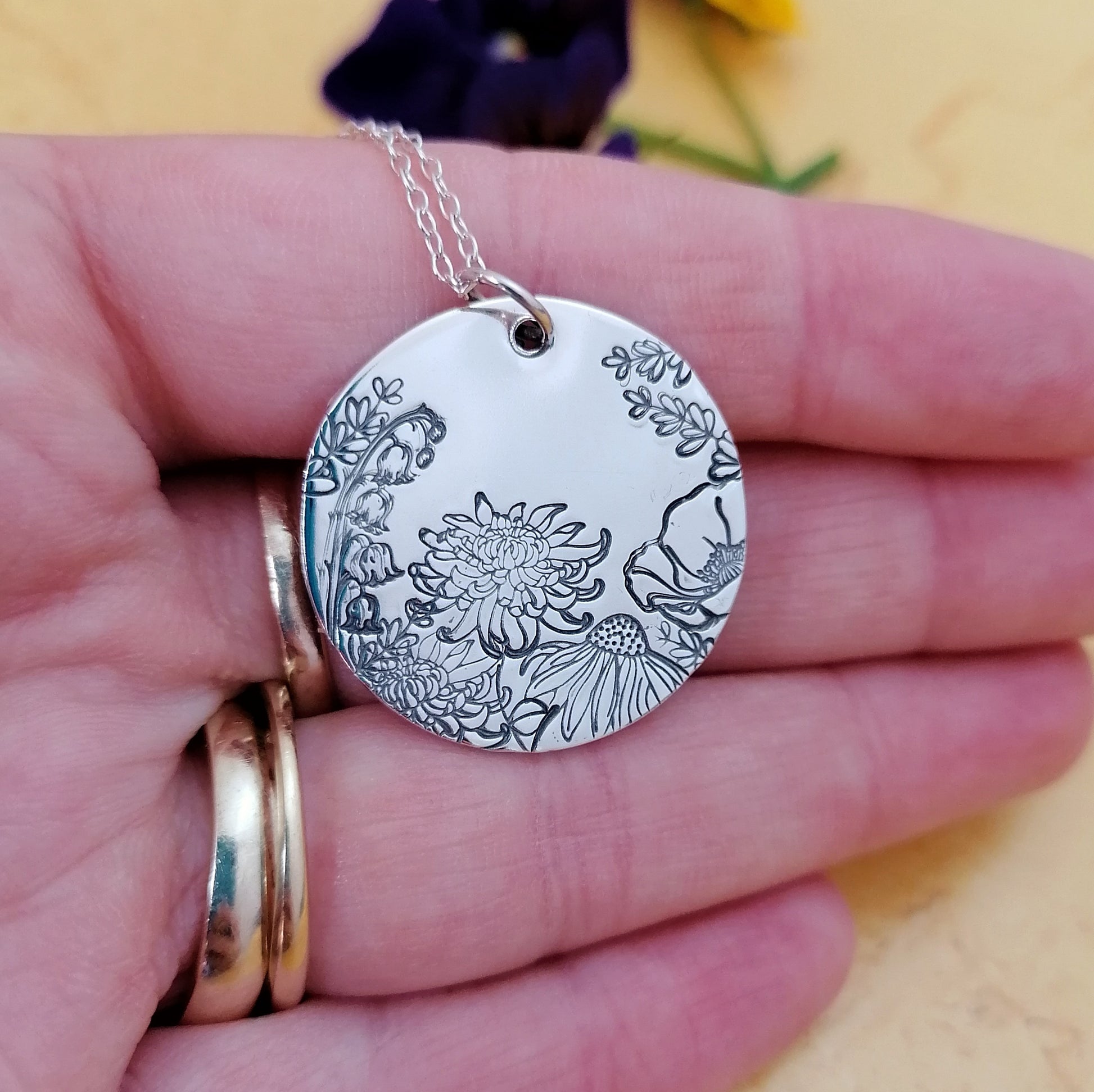This is a truly wonderful necklace featuring chrysanthemum, poppy, echinacea, lavender and lily of the valley flowers. Each flower is carefully hammered into the metal using a specially made metal stamp. This means that your necklace will be unique to you, no two will be exactly identical. This pendant measures approximately 25mm and is made from recycled sterling silver. This hangs on an 18" sterling silver chain.