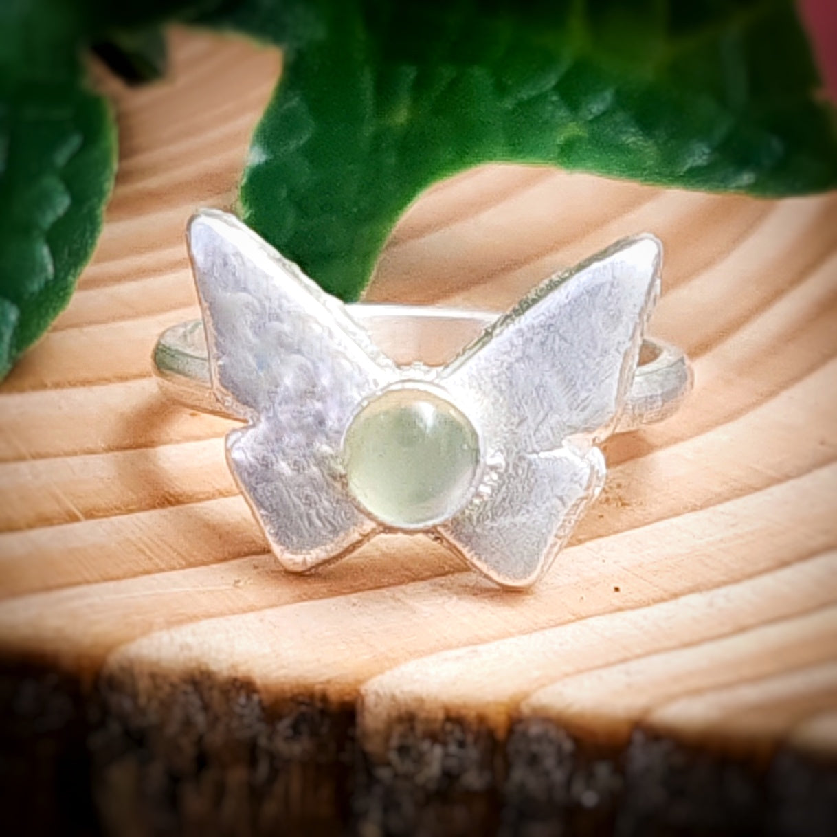 This gorgeous ring features a contemporary butterfly shape and stunning prehnite gemstone.