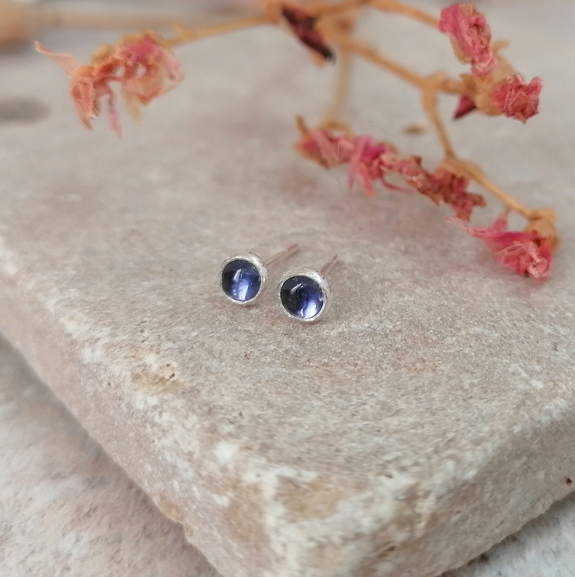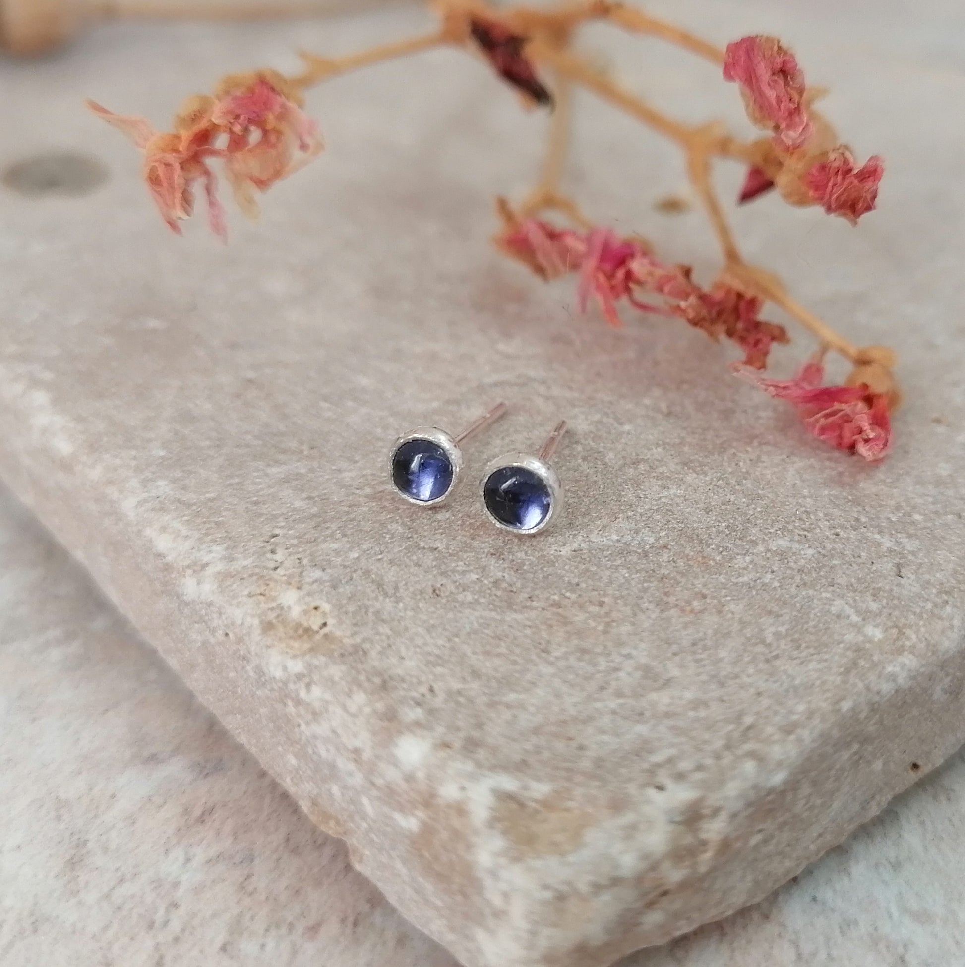 Iolite gemstone stud earrings. These beautiful studs are made from sterling silver and are suitable for pierced ears and are supplied with a push on butterfly back. The gemstone measures 4mm.