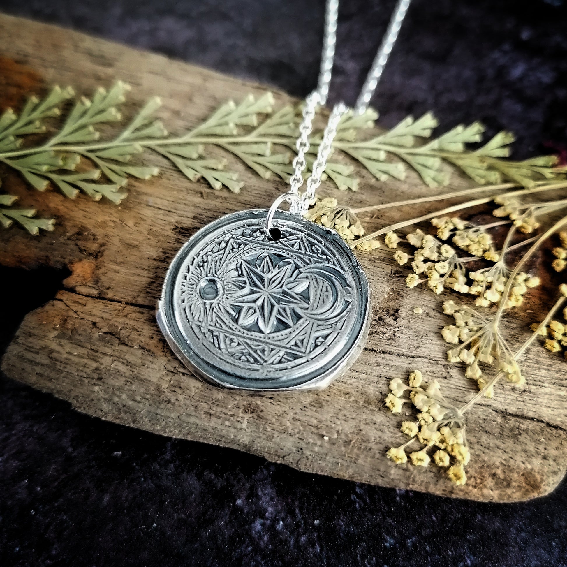 This unusual necklace is made from fine silver using a wax seal stamp. The pendant measures approximately 23mm and hangs from an 18" sterling silver belcher chain.