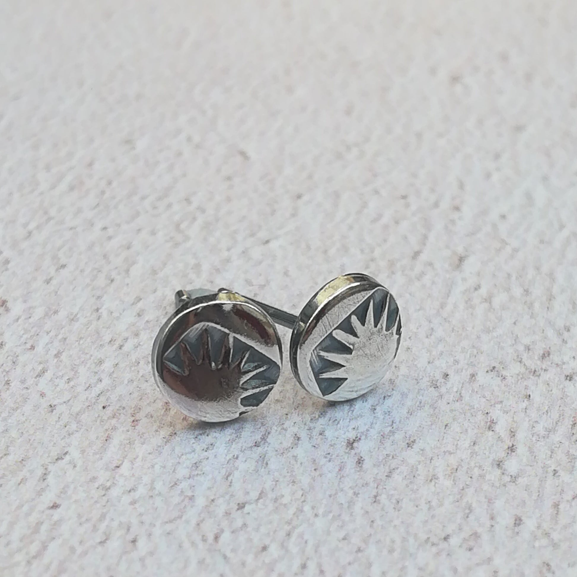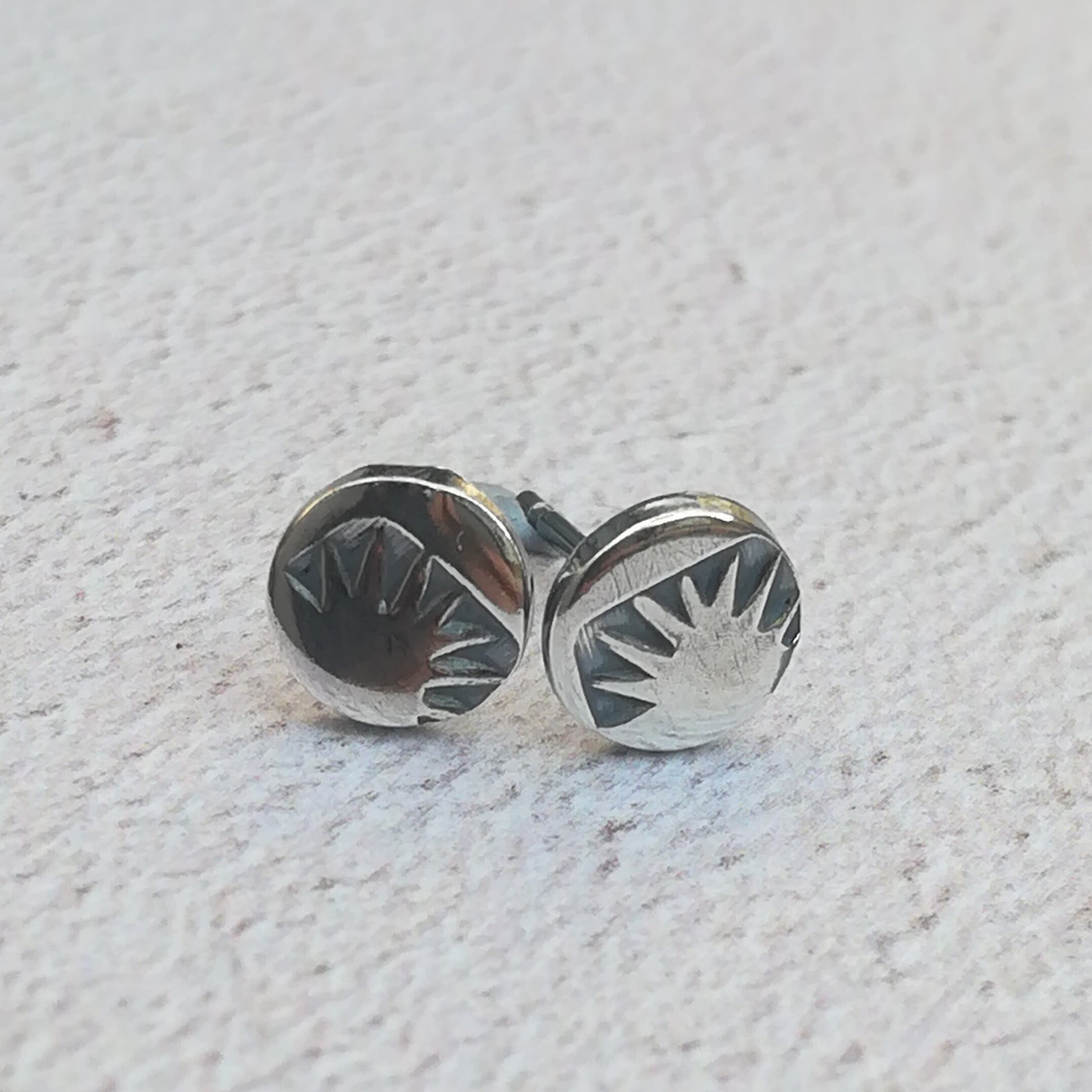 Pretty hand stamped sterling silver sunrise stud earrings.