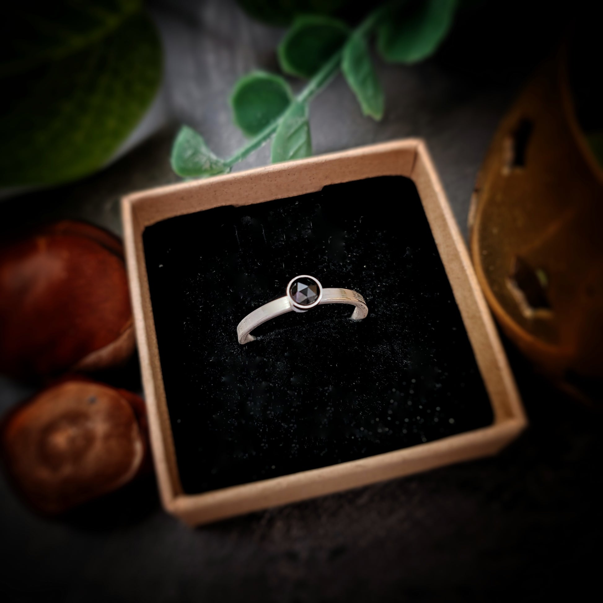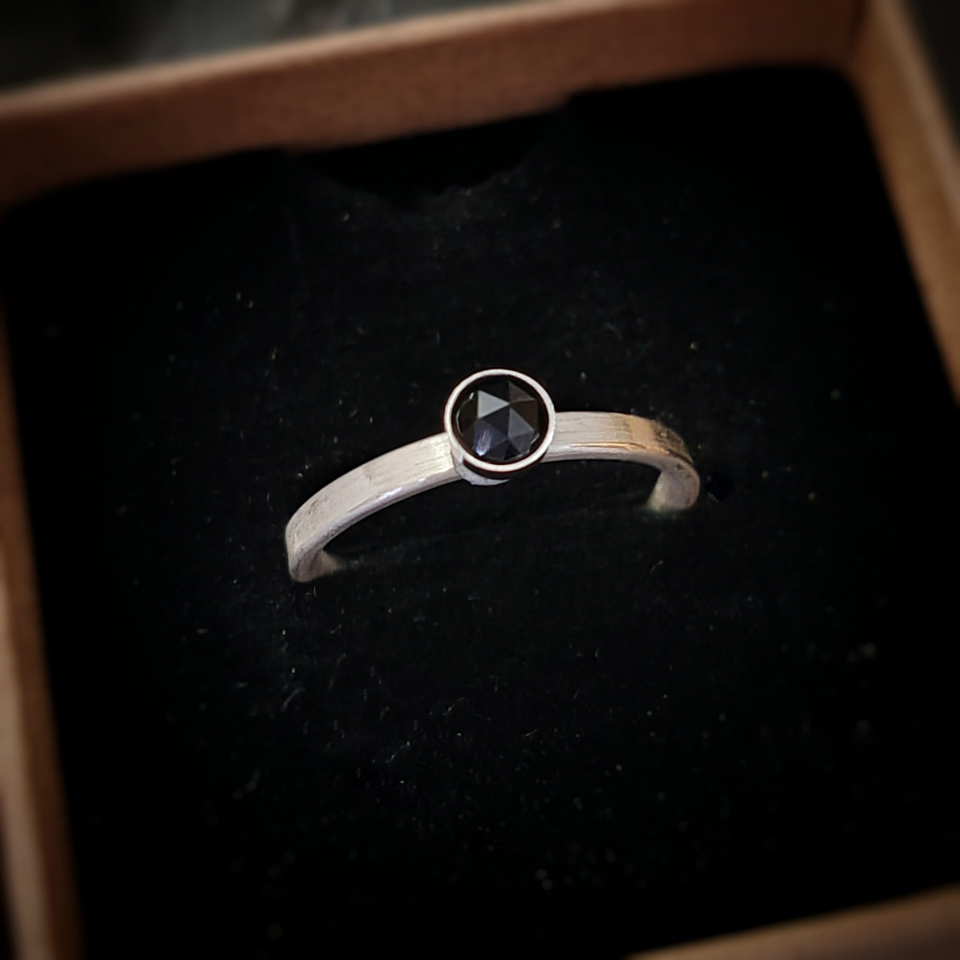 Stunning black spinel ring. Made from recycled silver in your ring size. The gemstone measures 4mm.