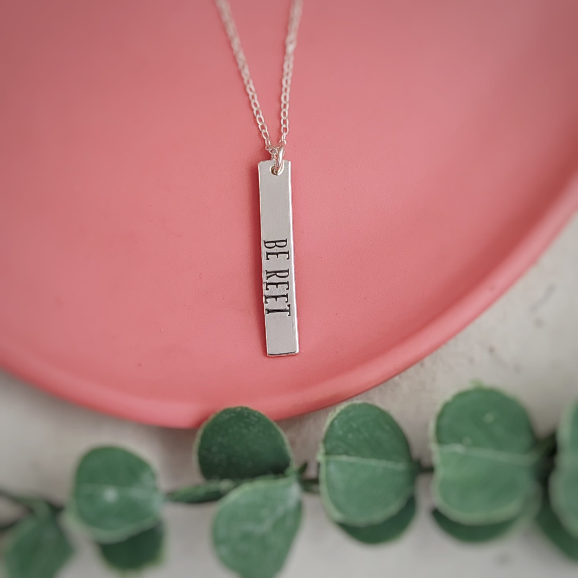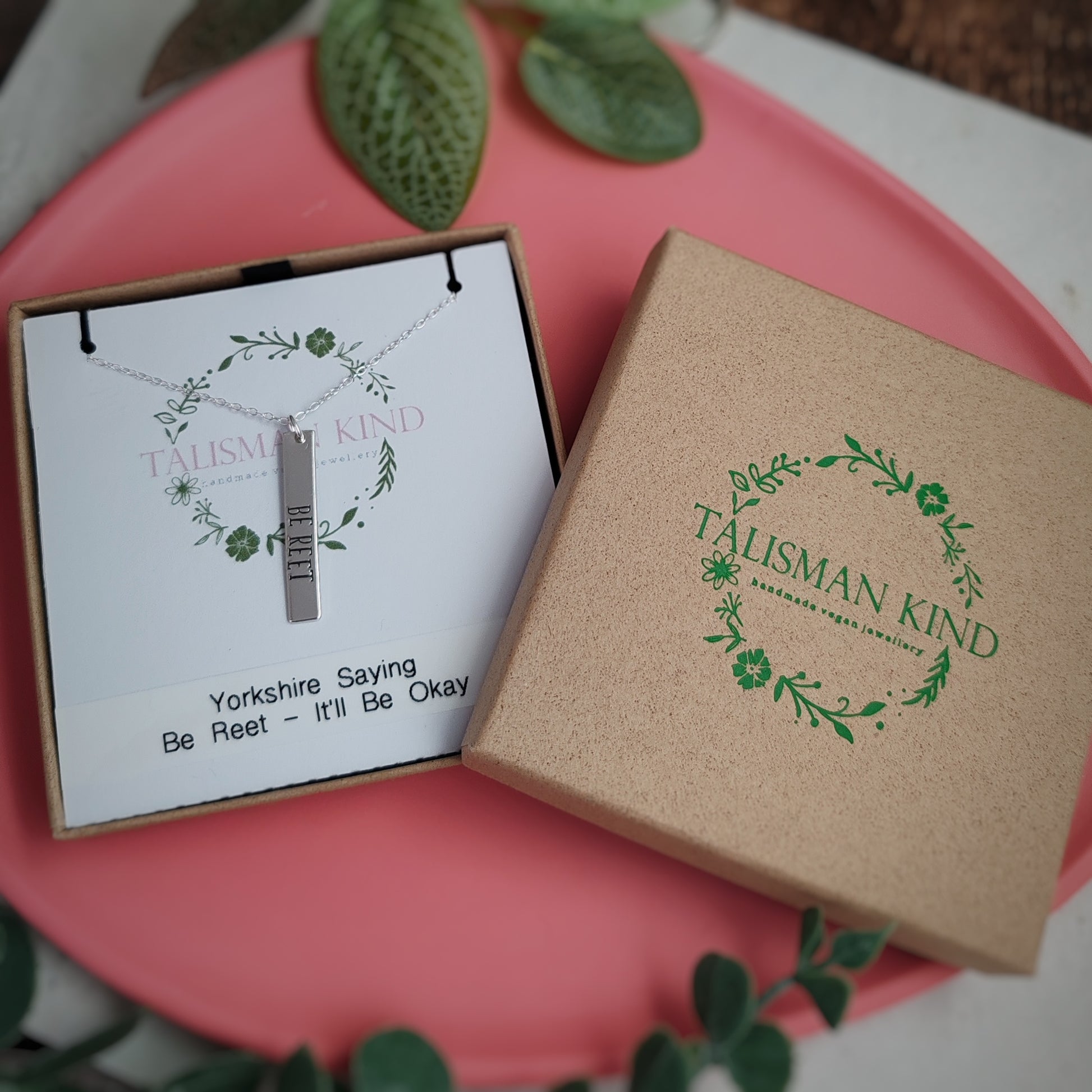 Our Yorkshire Sayings necklaces are made from recycled sterling silver and come on an 18" sterling silver chain. The pendants are created from the off-cuts of our ring making process so each one is a unique length and no two will be the same. They will all be 5mm width. The sayings are carefully hammered by hand into the metal one letter at a time.