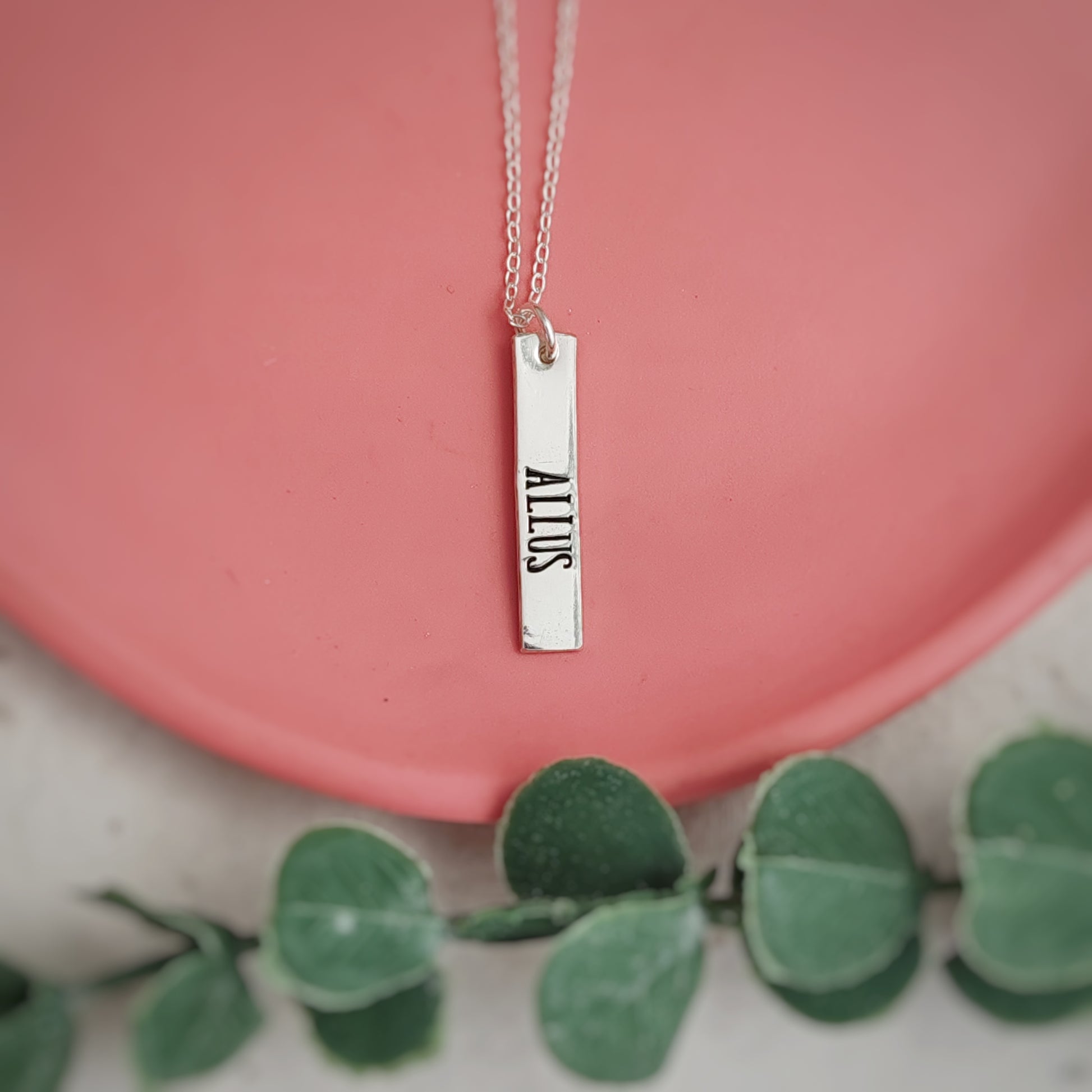 Our Yorkshire Sayings necklaces are made from recycled sterling silver and come on an 18" sterling silver chain. The pendants are created from the off-cuts of our ring making process so each one is a unique length and no two will be the same. They will all be 5mm width. The sayings are carefully hammered by hand into the metal one letter at a time.