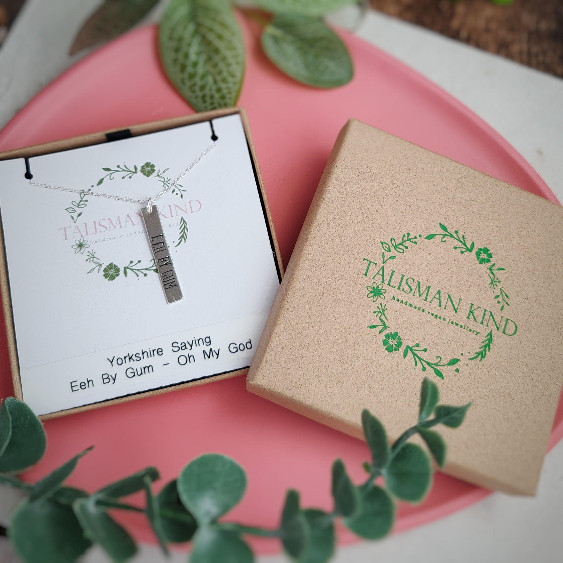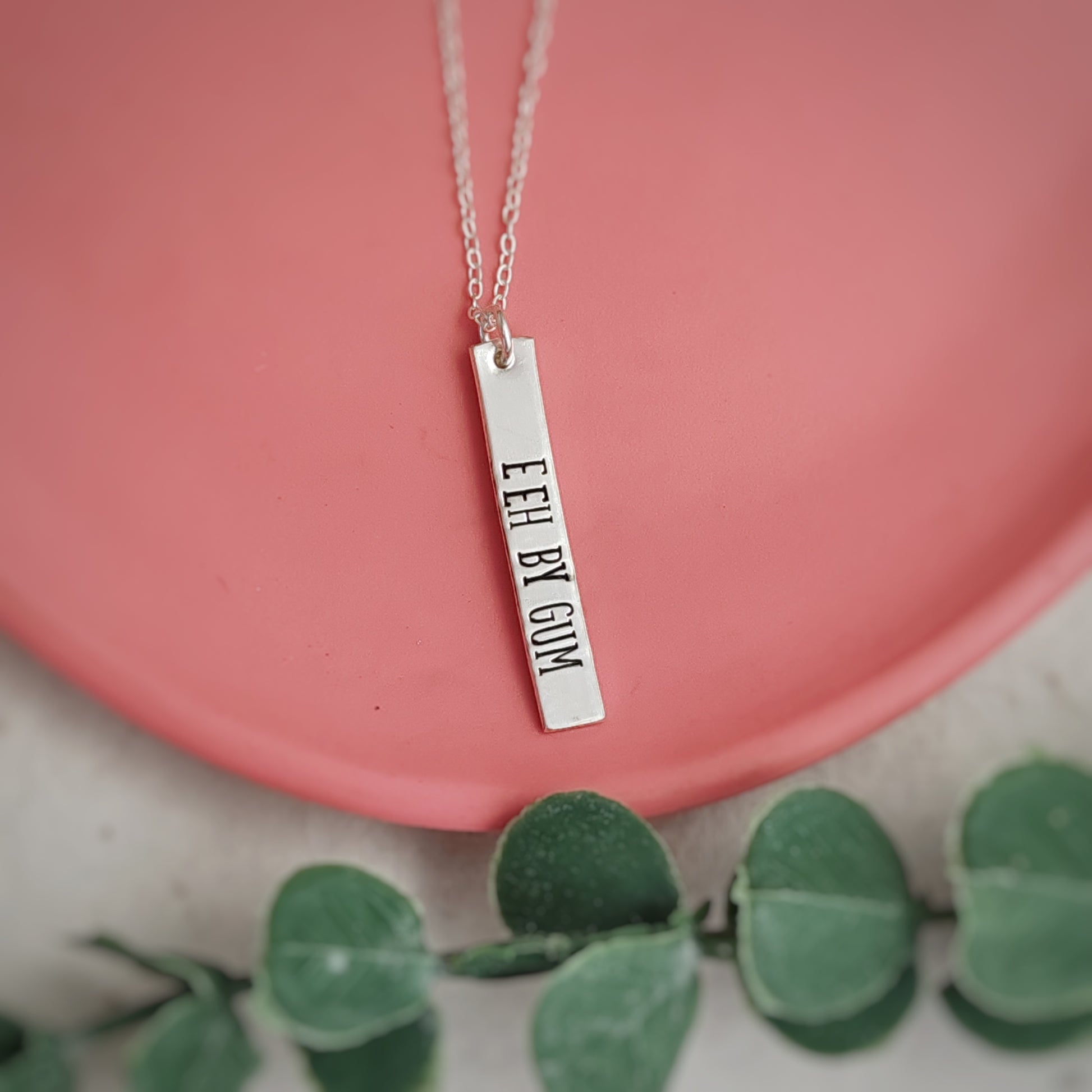 Our Yorkshire Sayings necklaces are made from recycled sterling silver and come on an 18" sterling silver chain. The pendants are created from the off-cuts of our ring making process so each one is a unique length and no two will be the same. They will all be 5mm width. The sayings are carefully hammered by hand into the metal one letter at a time.