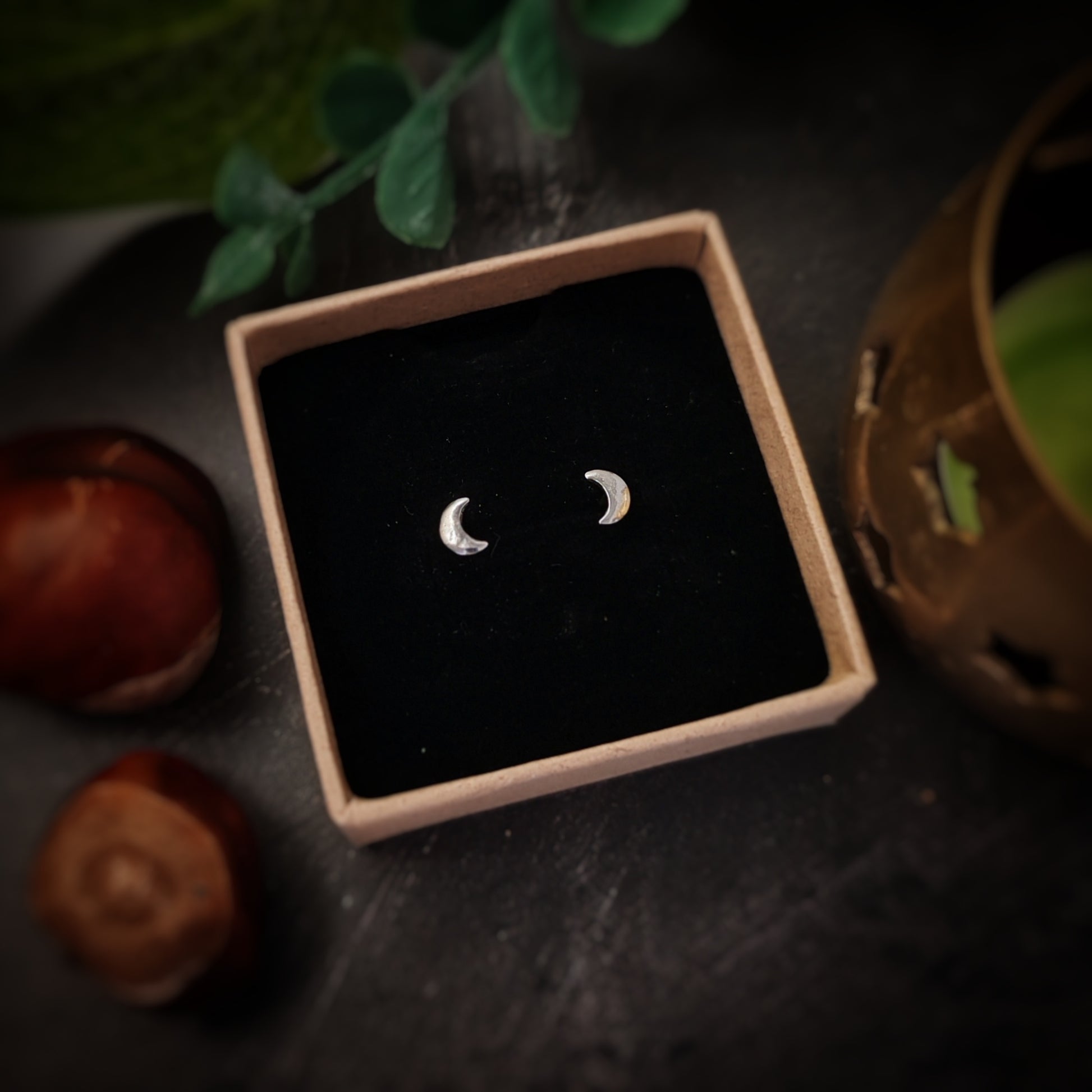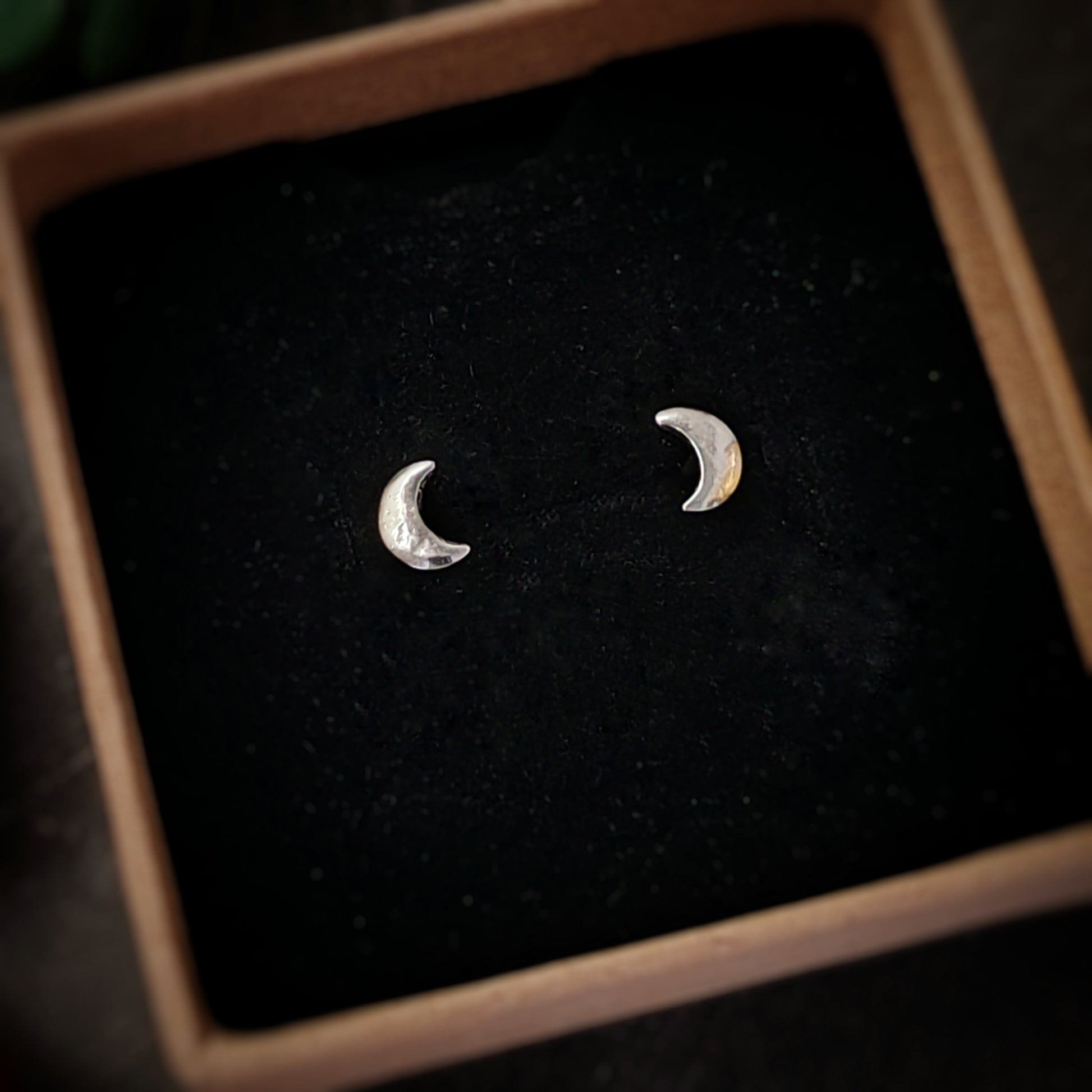 Stunning recycled silver crescent moon stud earrings. These dainty studs measure appropriately 6mm. They are suitable for pierced ears and come with a push on butterfly back.