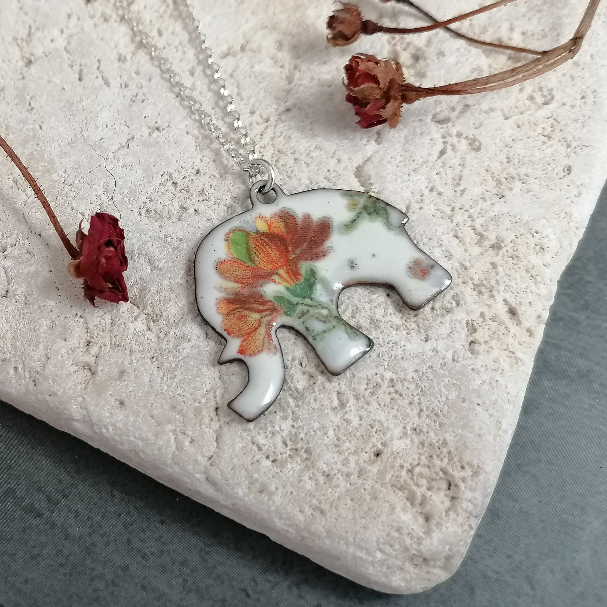 Beautiful enamelled floral elephant necklace. This necklace is so pretty! Featuring a beautiful floral pattern on an off-white, creamy background. The elephant is made from copper which has been enamelled on both sides. The back is a dark grey/blue coloured counter enamel. This hangs from a pretty 18" sterling silver belcher chain.