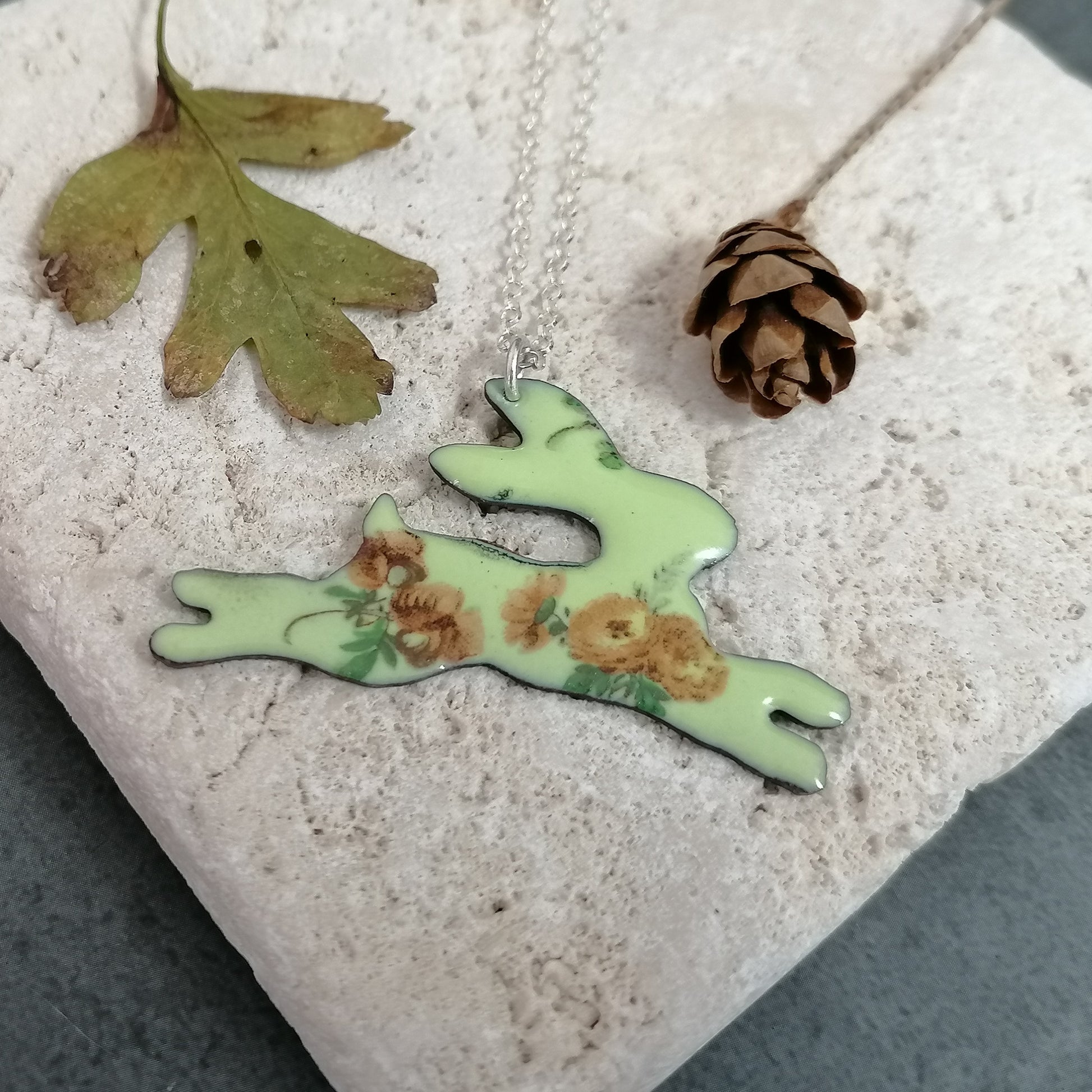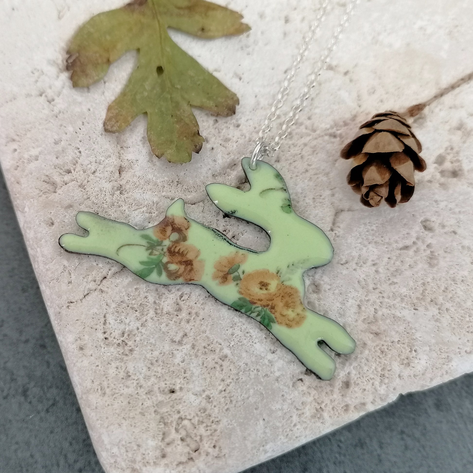 Spring is certainly in the air with this one of a kind piece of jewellery! Stunning leaping hare pendant in a beautiful spring green colour featuring a pretty floral pattern. The hare is made from copper which is enamelled on both sides. The back is a dark grey/blue coloured counter enamel. This hangs from a pretty 18" sterling silver belcher chain.