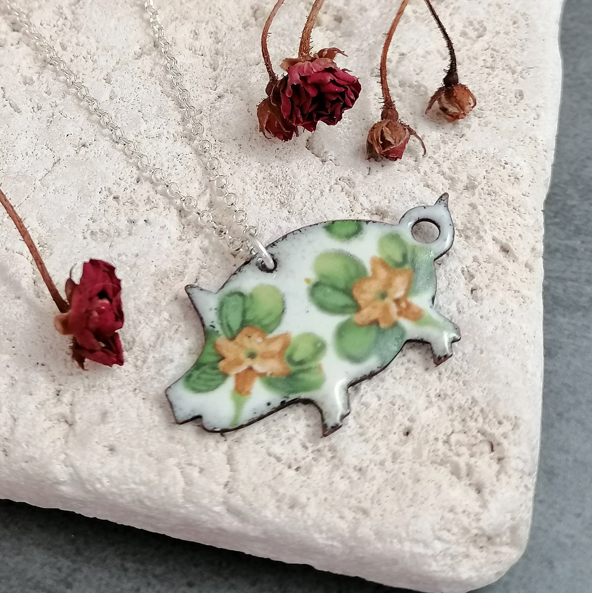 Absolutely gorgeous floral pig necklace. The pig pendant is made from copper and enamelled on both sides. The back has a dark grey/blue coloured counter enamel. The pig is a gorgeous ivory colour with pretty flowers. This hangs from a delicate 18" sterling silver belcher chain.