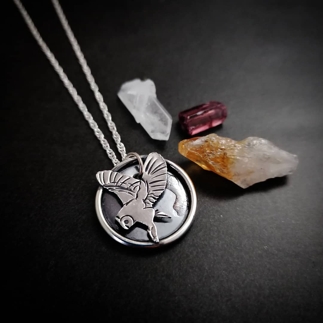 This beautiful necklace features a hand cut owl flying through the night sky. It is made from recycled sterling silver. The pendant measures 25mm and hangs from an 18" sterling silver chain.