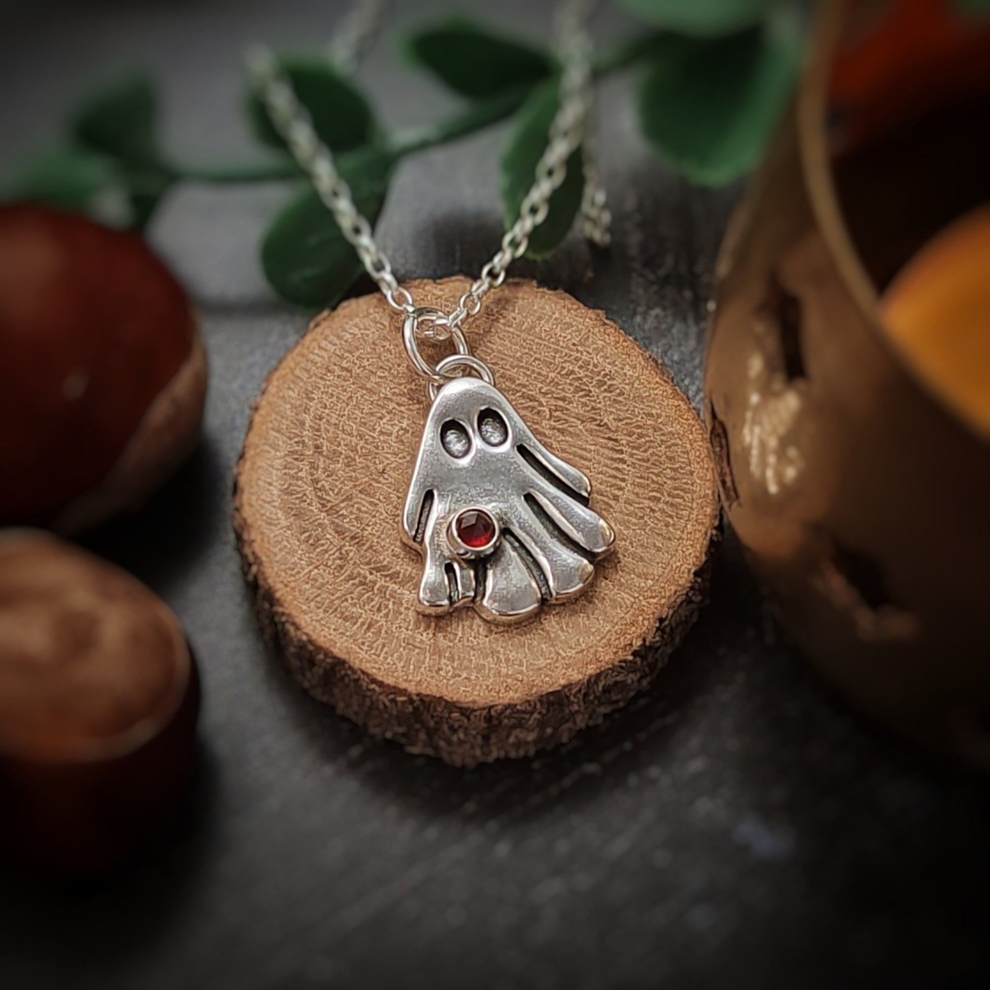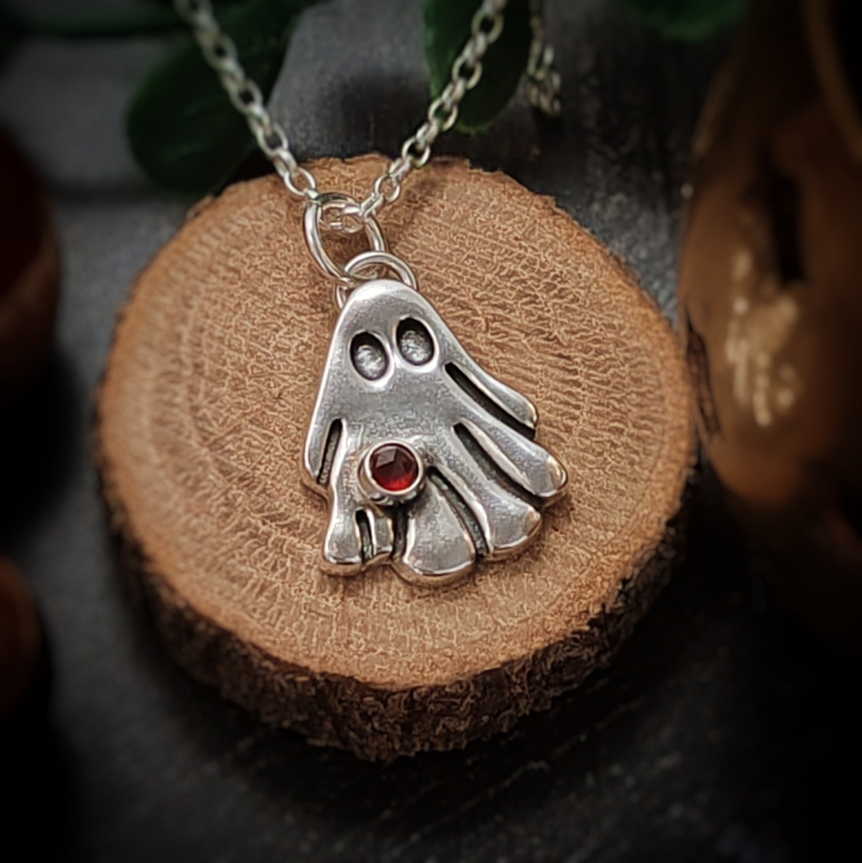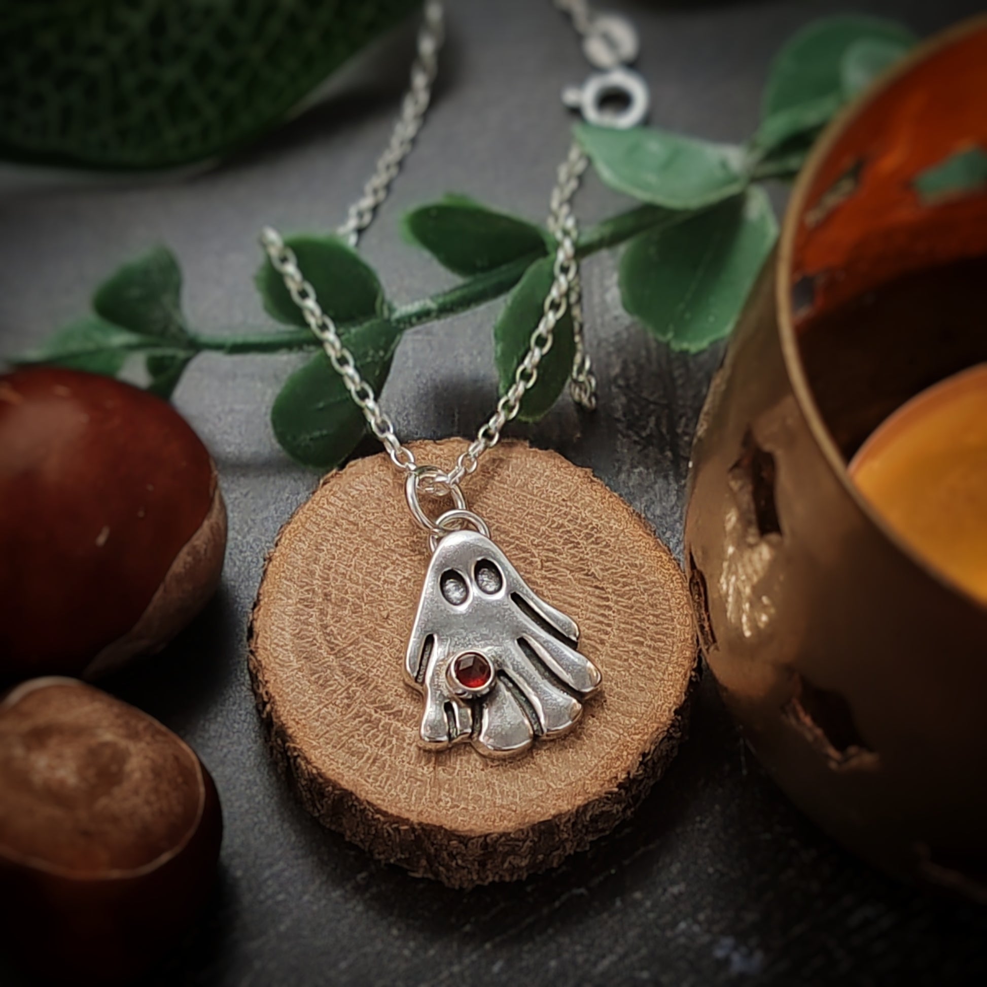 Gorgeous ghost necklace. This cute ghoul is made from recycled silver and adorned with a sparkly 3mm red garnet gemstone.