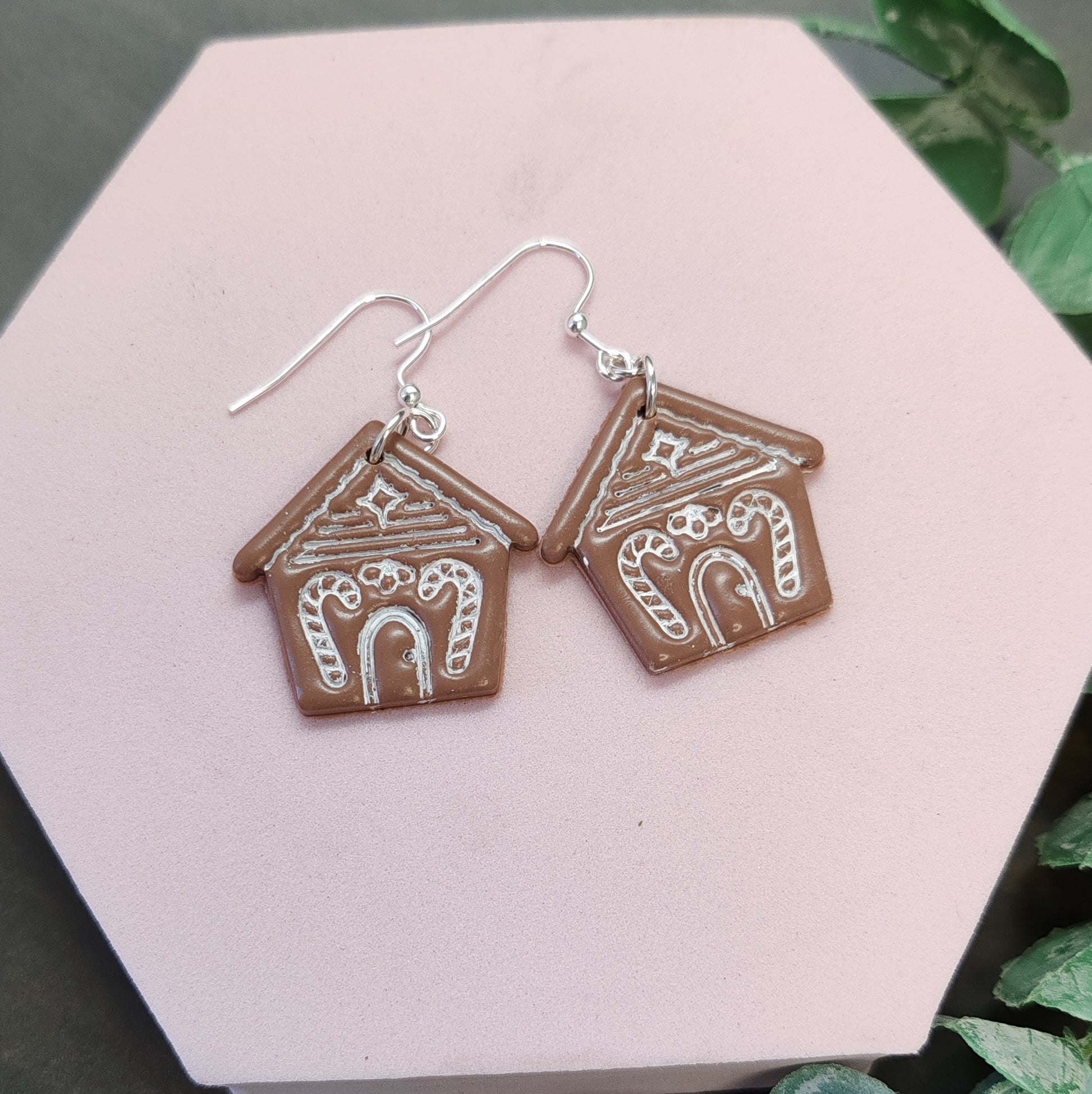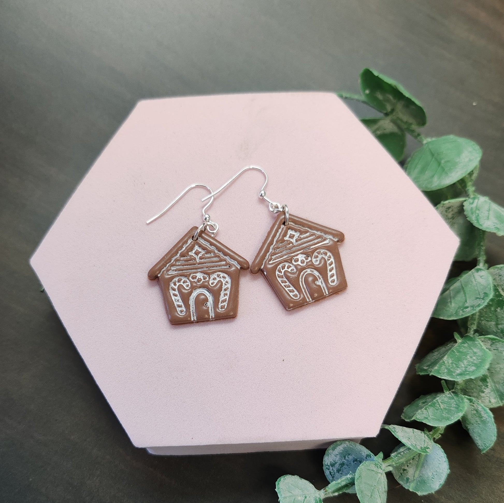 Lovely gingerbread house earrings. They are handmade made from vegan polymer clay. They come on sterling silver ear hooks.