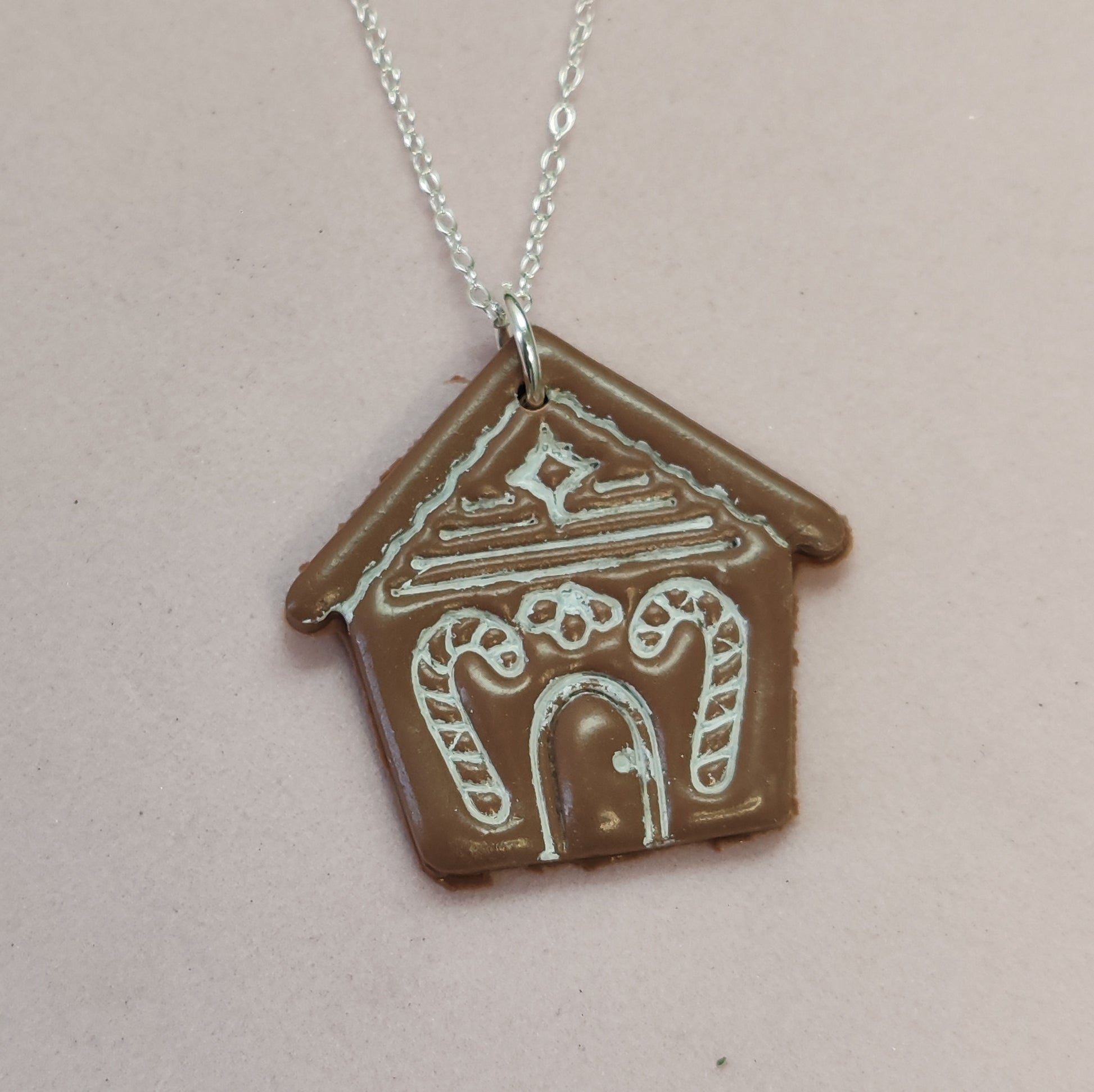 Adorable gingerbread house necklace. The pendant is handmade from polymer clay and hangs from an 18" sterling silver chain.