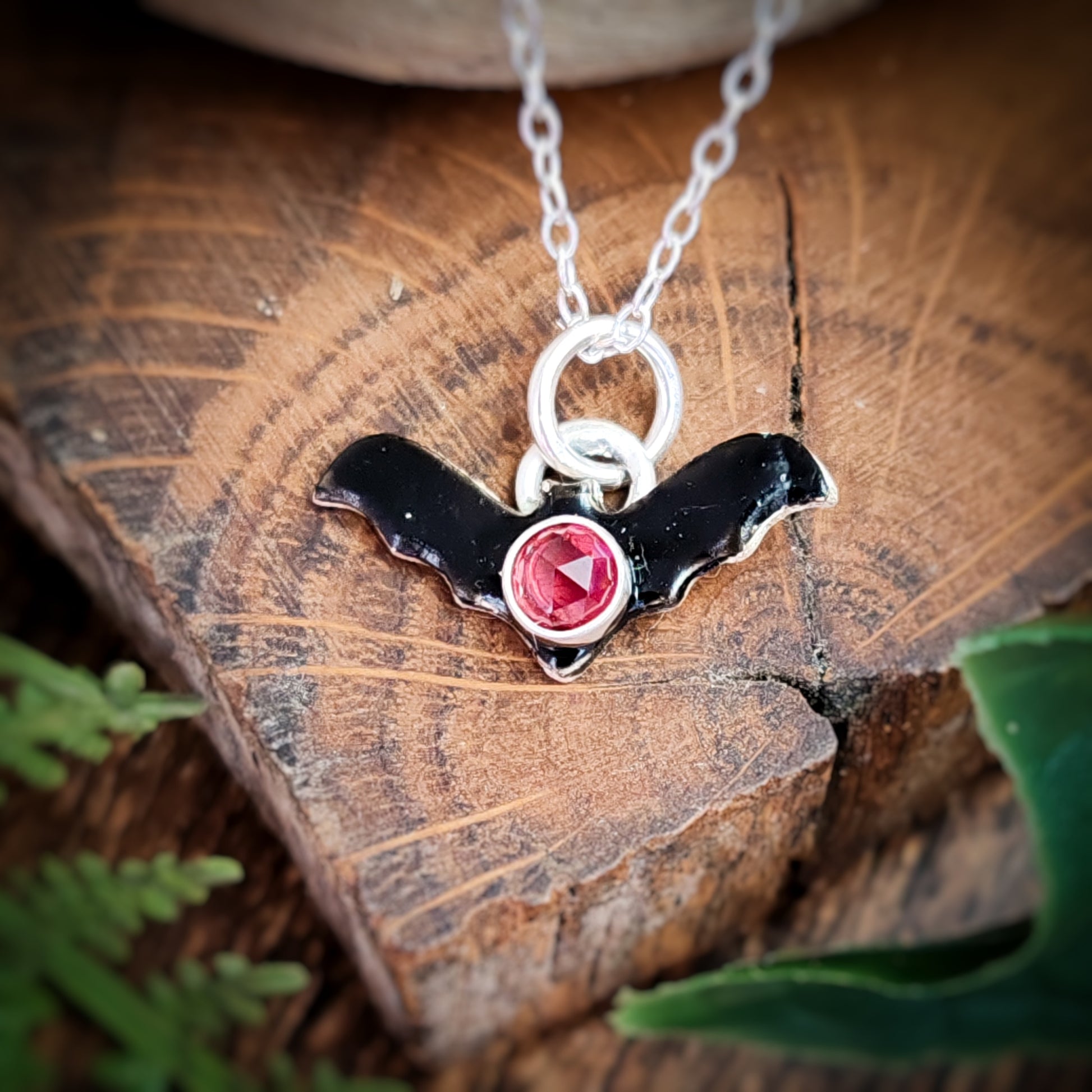 Introducing our hand-painted Bat Necklace, a unique and eco-friendly accessory that's perfect for animal lovers and nature enthusiasts. This exquisite necklace features a bat shaped recycled silver pendant which has been meticulously hand-painted. Adorning the bat pendant is a beautiful rhodolite garnet gemstone, adding a touch of elegance and charm. The necklace comes with an 18" chain, ensuring it sits gracefully around your neck. The pendant measures approximately 19mm x 10mm.