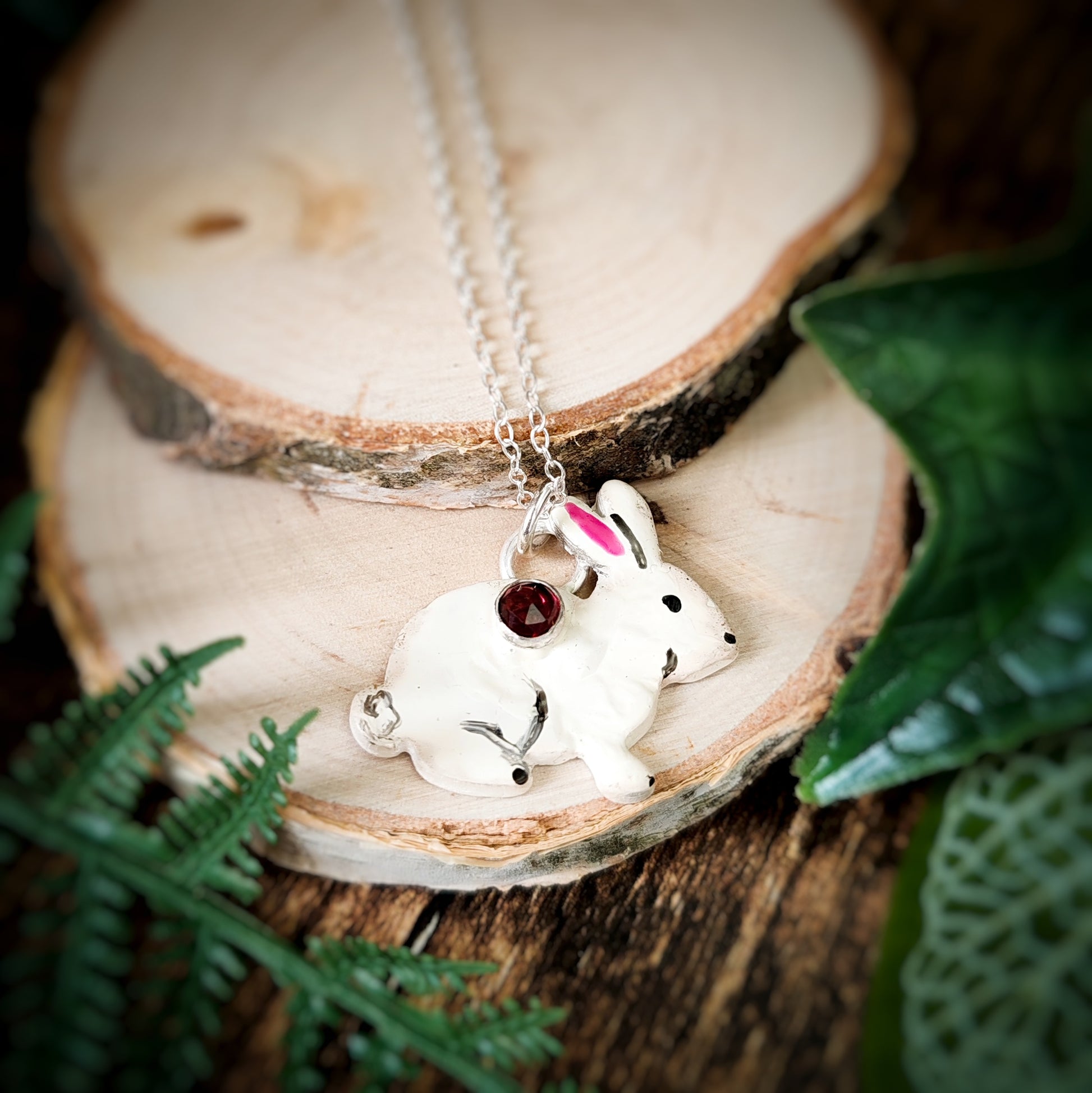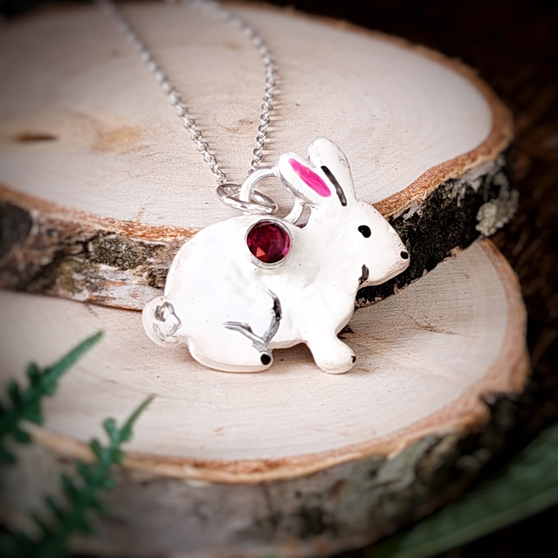 The rabbit is made from recycled silver and hangs from an 18" chain.