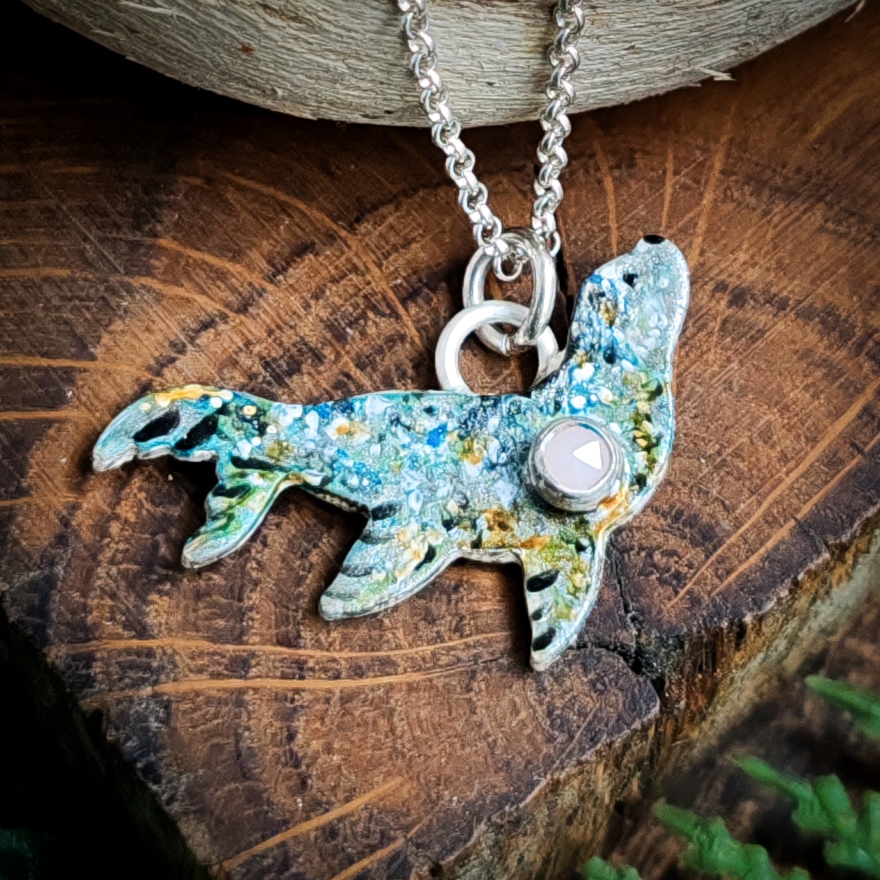 This stunning necklace is made from recycled silver and has been carefully painted by hand. It features a pretty rose quartz gemstone.