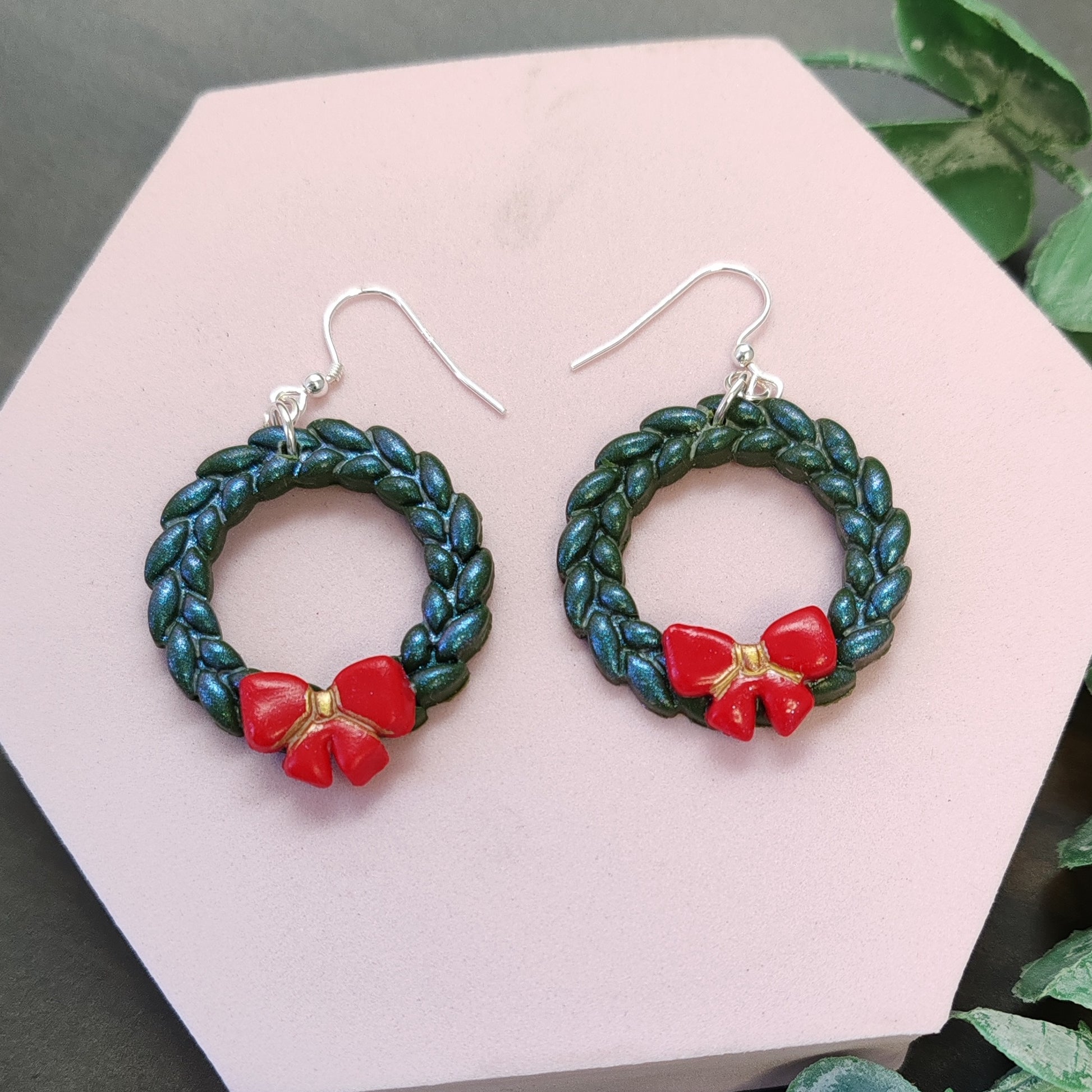 Large Christmas Wreath earrings made from vegan polymer clay. These have a lovely bit of sparkle to them and are perfect for the holiday season. They measure approximately 35mm and come with sterling silver ear hooks.