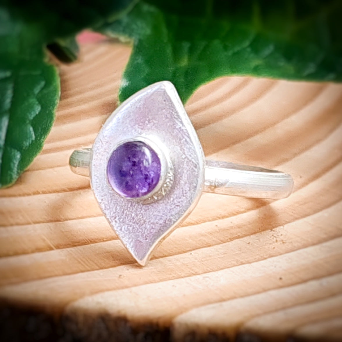 This gorgeous ring features a contemporary leaf shape and stunning amethyst gemstone.