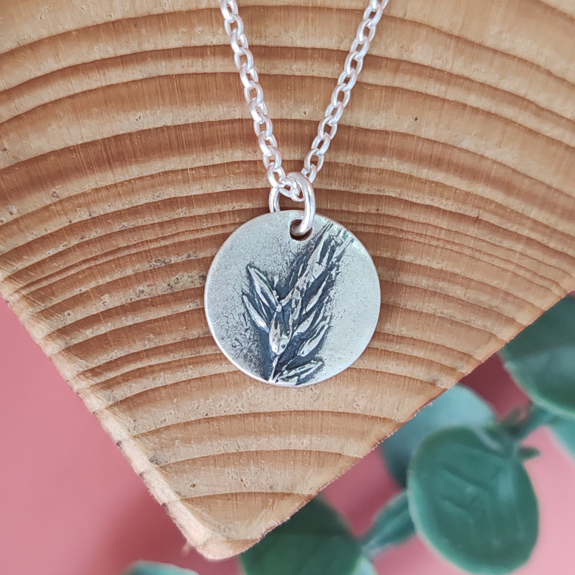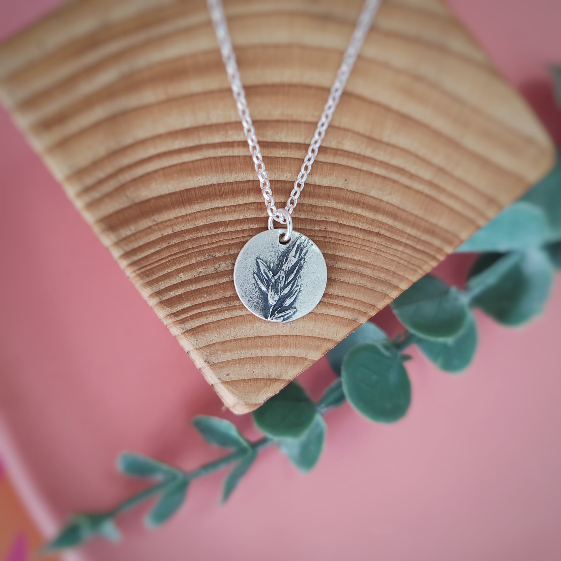 Stunning solid silver pendant depicting real grass. This beautiful piece is made using a mould of real grass with the impression taken in silver clay. Silver clay is an amazing product that acts like normal clay but once fired leaves solid silver. It is made from recycled silver from the electronics industry so is an eco friendly choice too. This beautiful pendant hangs from an 18" recycled sterling silver chain.