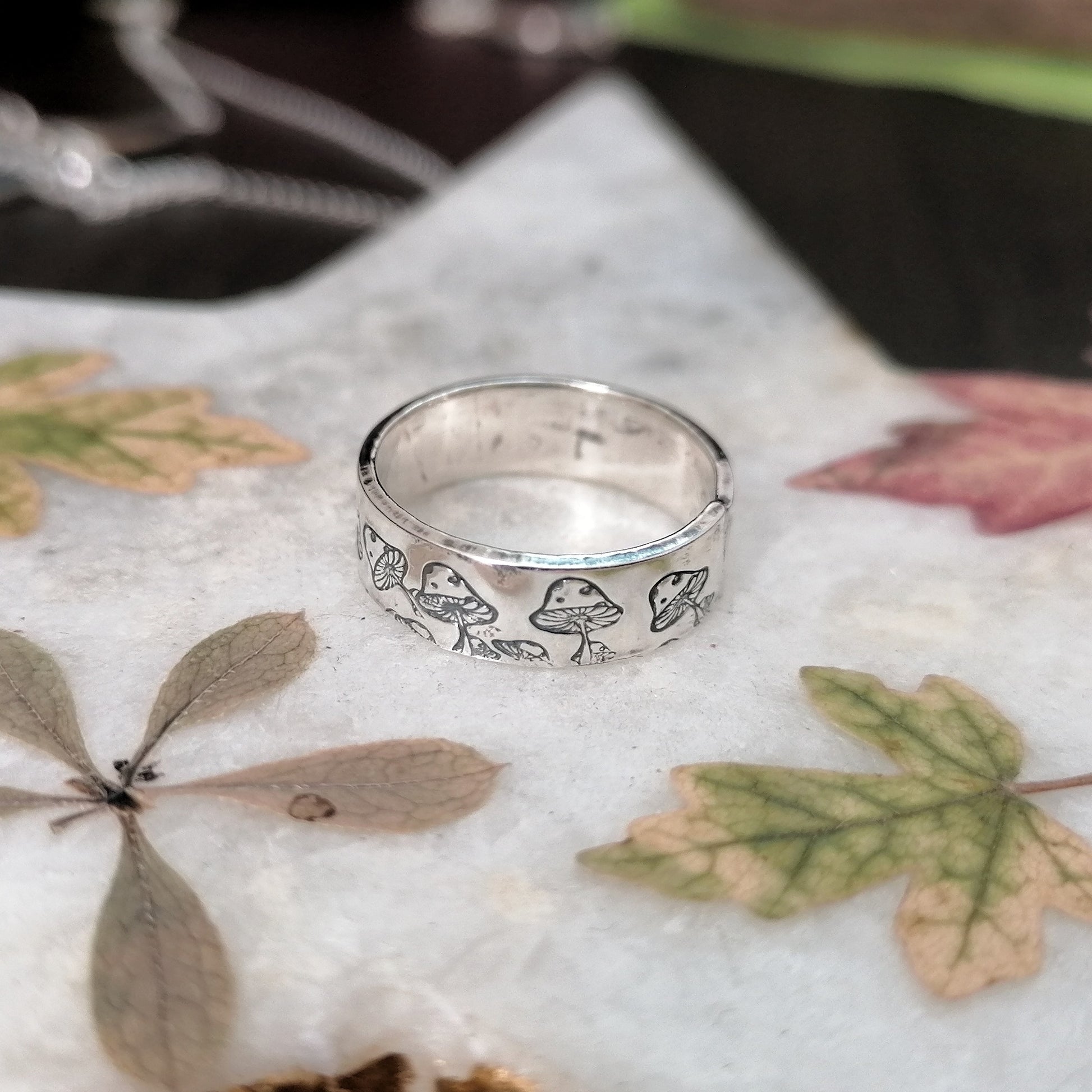 This is a gorgeous hand stamped ring featuring magical mushrooms around the band. Your ring will be made from recycled sterling silver measuring 5mm in width and made to your specific ring size.