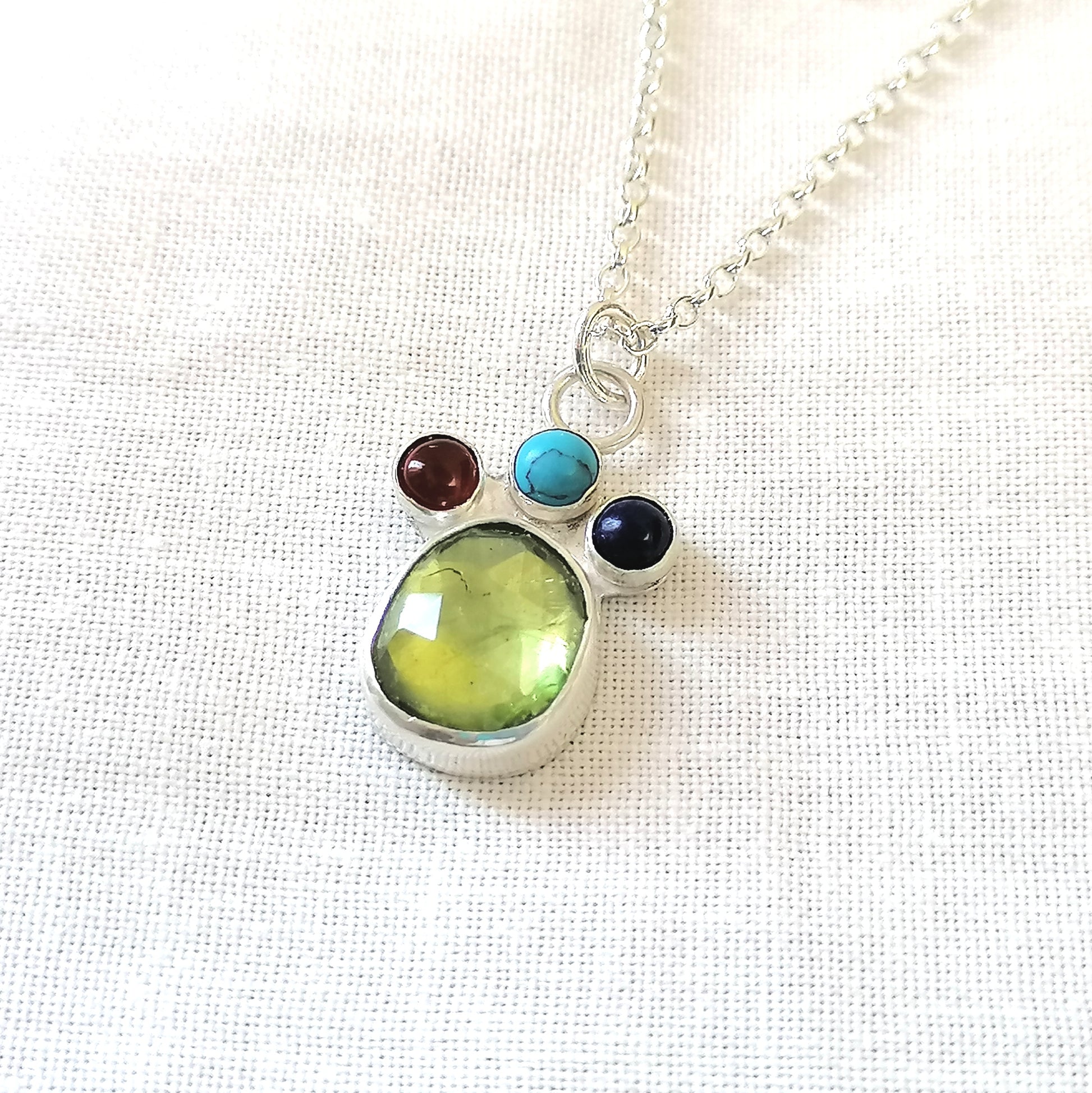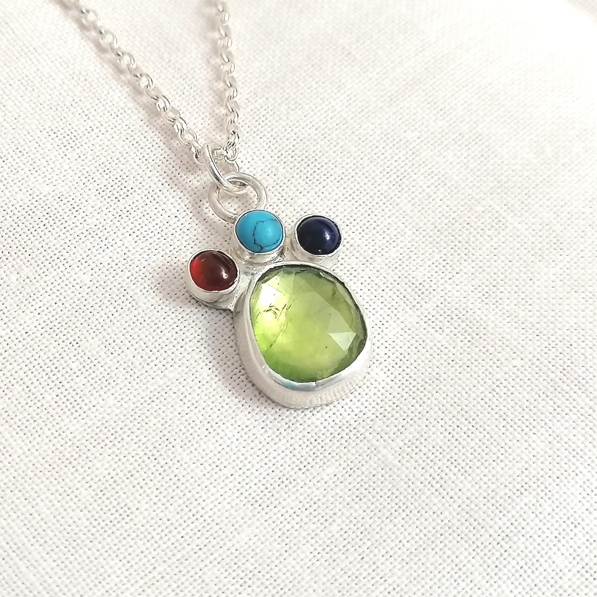 This is a stunning necklace featuring a beautiful rose cut peridot stone nestled in recycled sterling silver and crowned beautifully by turquoise, lapis lazuli and garnet.