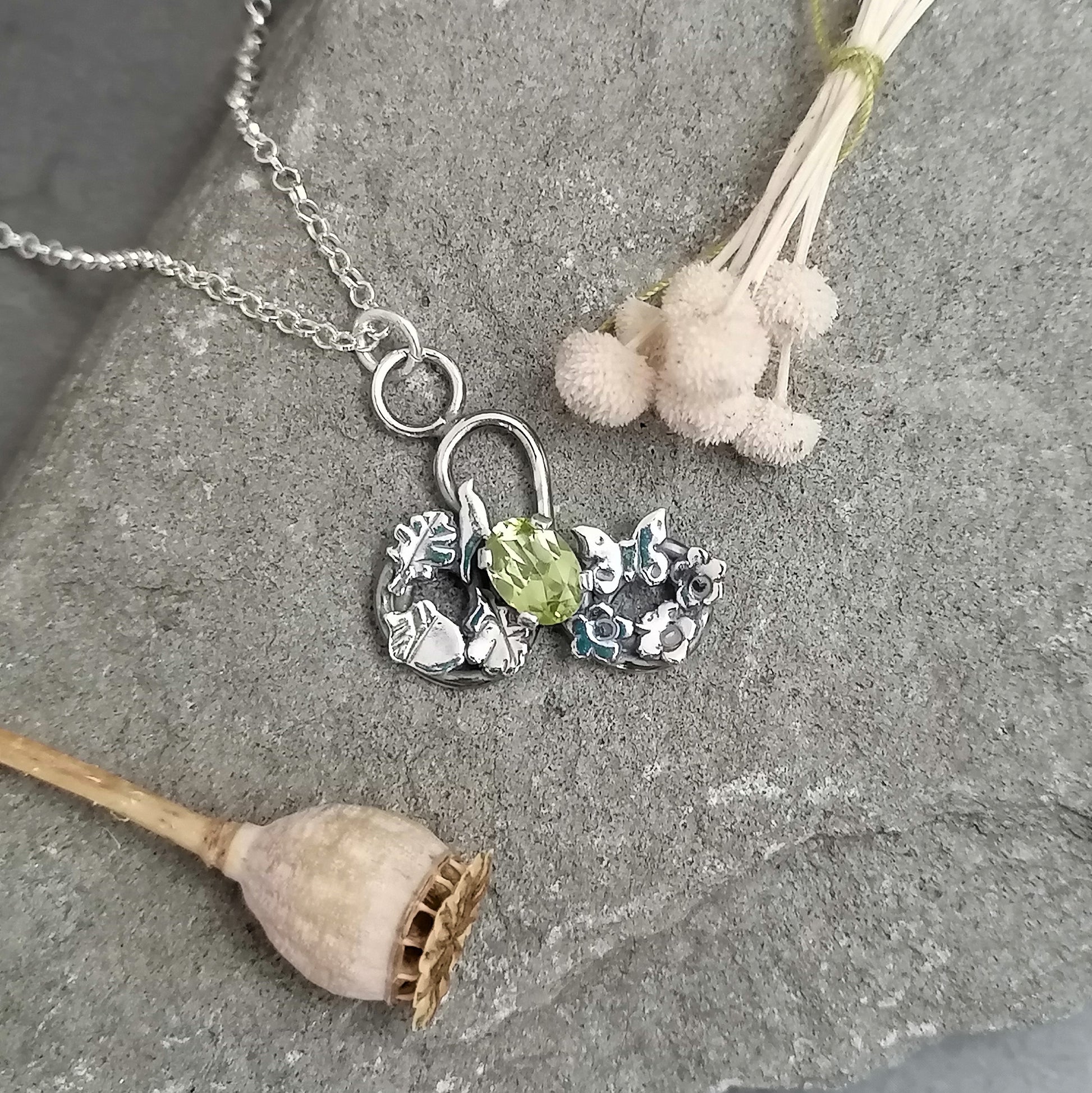 This is a stunning necklace featuring a beautiful rose cut peridot gemstone. This is surrounded by a spring scene of flowers, butterfly, leaves and bird. The pendant is made from recycled sterling and fine silver and measures approximately 23mm x 22mm. This hangs from an 18" sterling silver belcher chain.