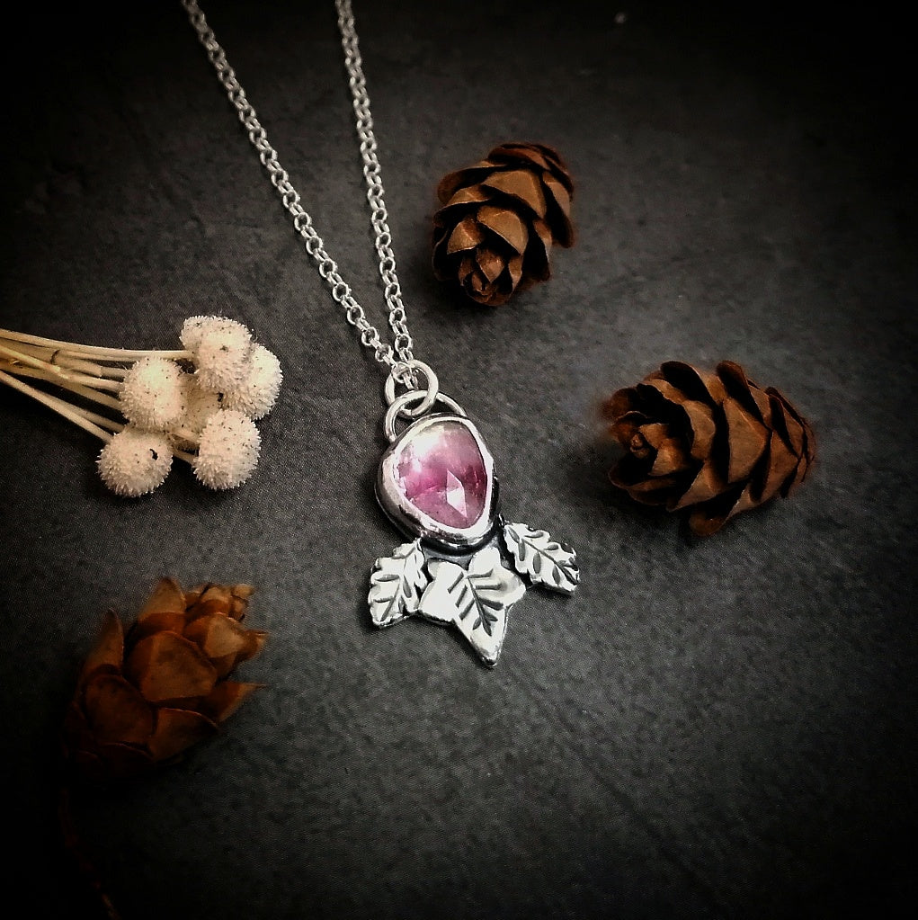 This is a stunning pendant featuring a pretty sparkling rose cut pink tourmaline gemstone nestled amongst hand forged silver ivy and oak leaves. This is made from 100% recycled silver. This beautiful pendant hangs from an 18" sterling silver belcher chain.