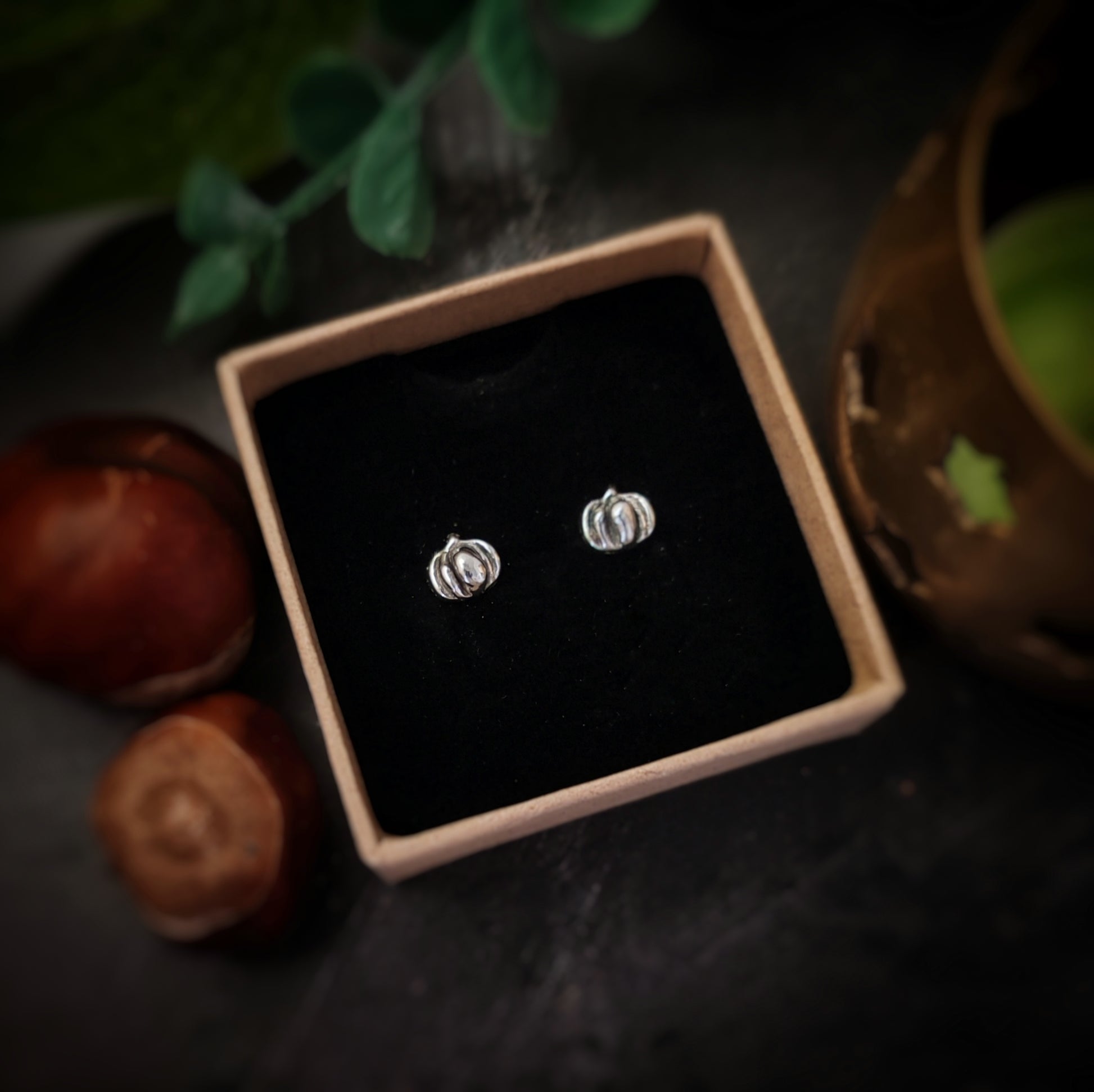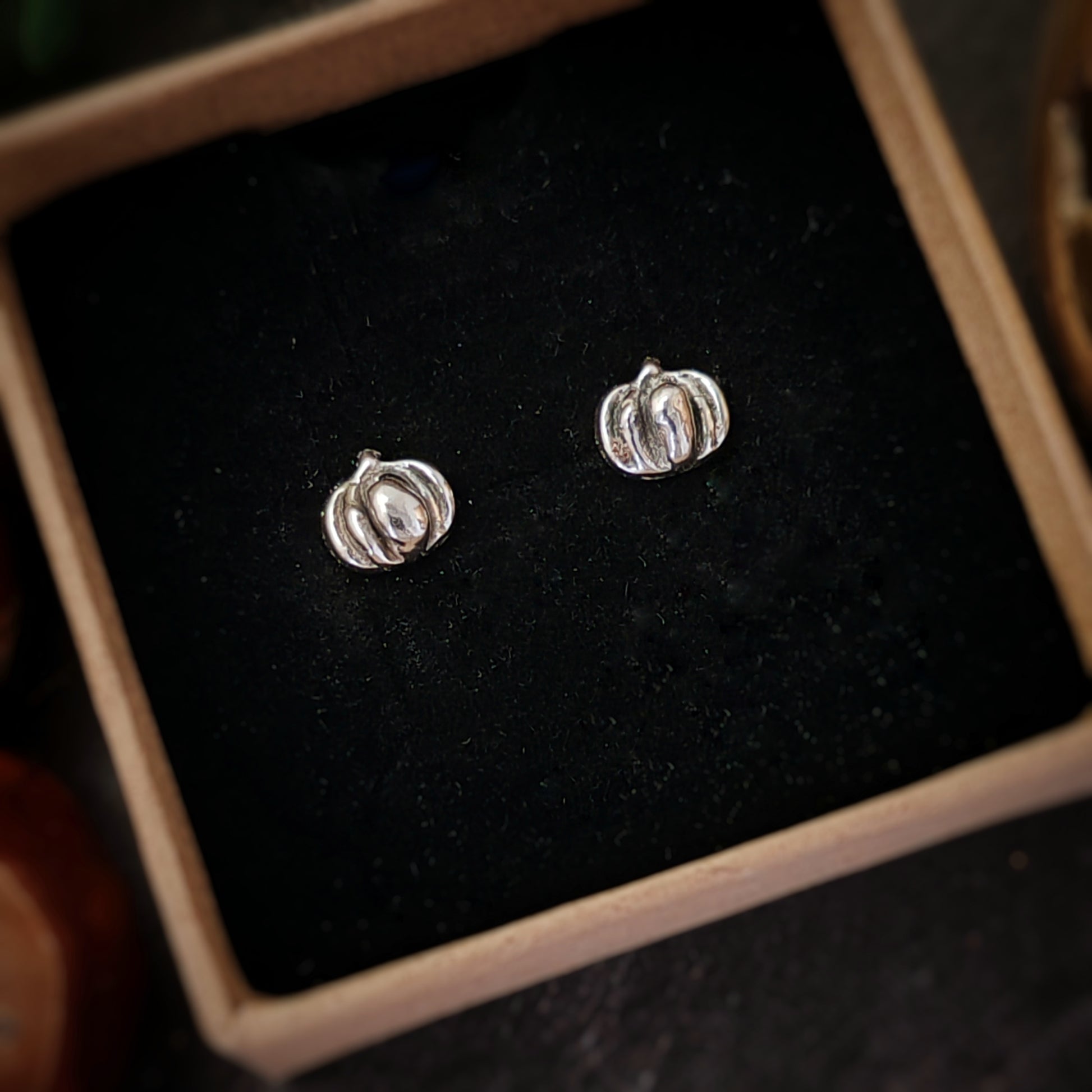 Stunning recycled silver cute pumpkin stud earrings. These studs measure appropriately 8mm wide. They are suitable for pierced ears and come with a push on butterfly back.