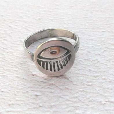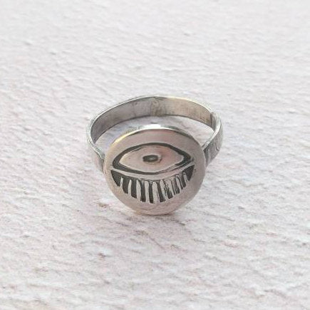 The band measures 3mm wide with the handstamped disc measuring 12mm in diameter.