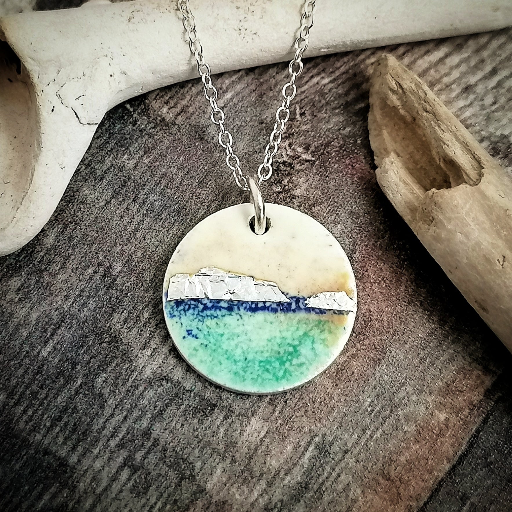 This stunning abstract seascape necklace features hazy colours and a representation of cliffs made from fine silver foil. This is a truly stunning one of a kind piece. Made from fine silver, the pendant measures approximately 19mm and hangs from a pretty 18" sterling silver belcher chain.