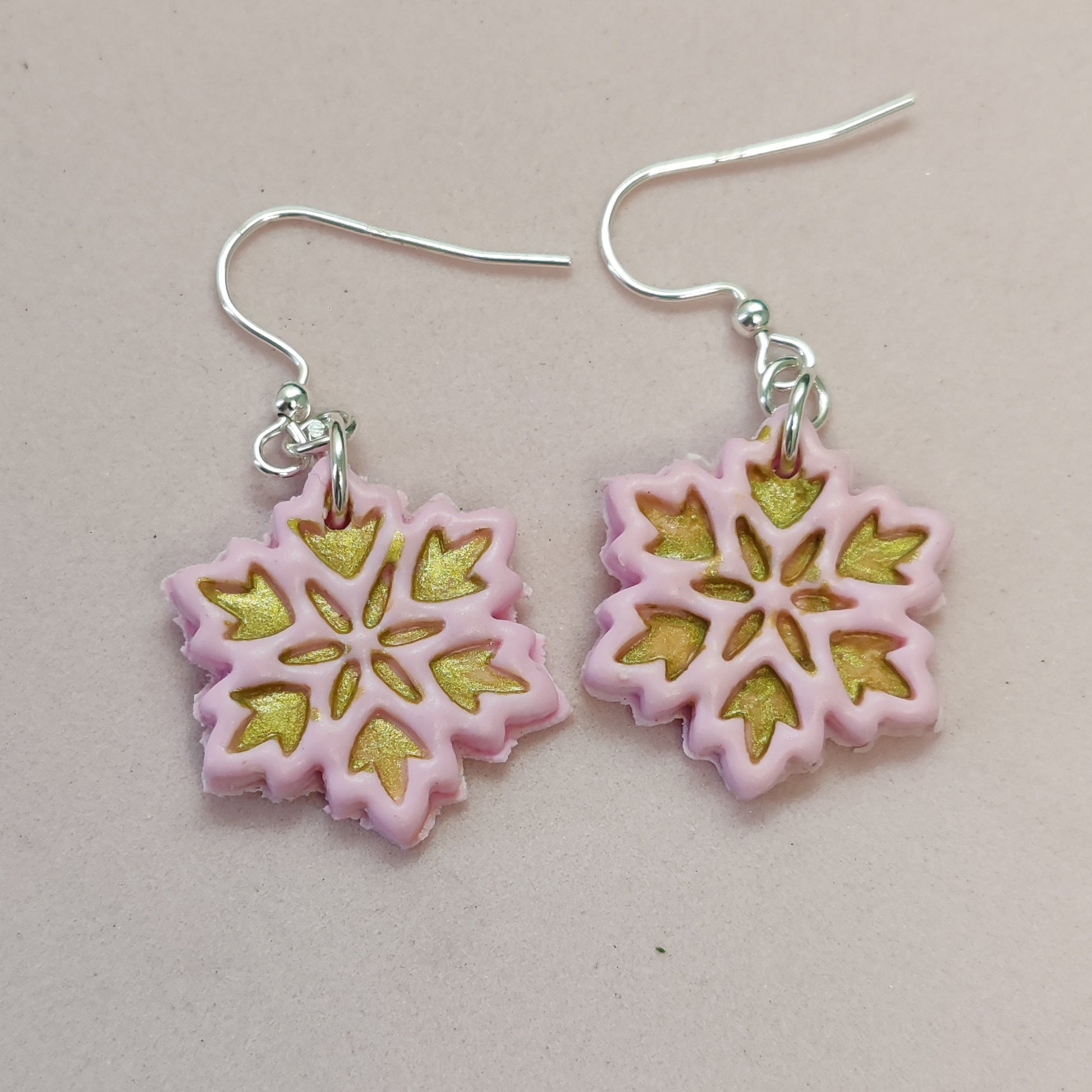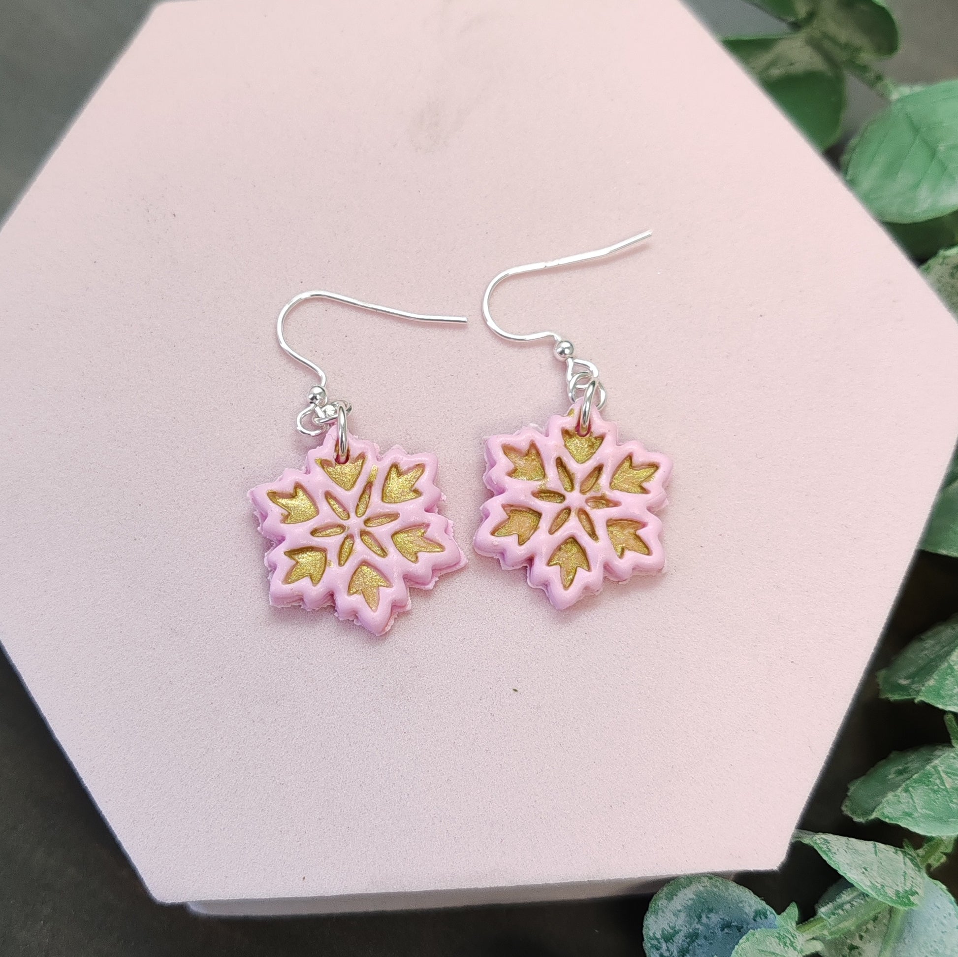 Oh so pretty pink and gold snowflake earrings. These are handmade from vegan polymer clay. They come on sterling silver ear hooks.
