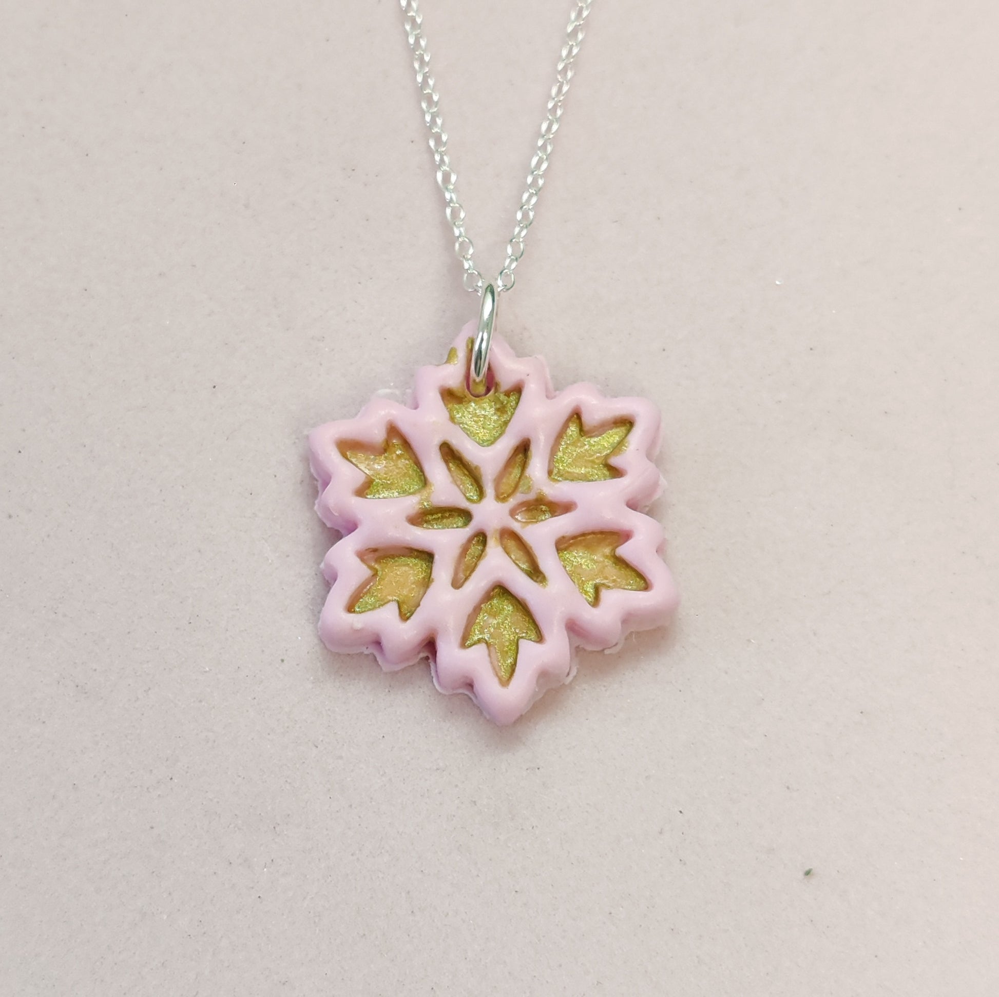 Pretty pink and gold snowflake necklace. The pendant is handmade from vegan polymer clay and measures approximately 25mm. This hangs from an 18" sterling silver chain.