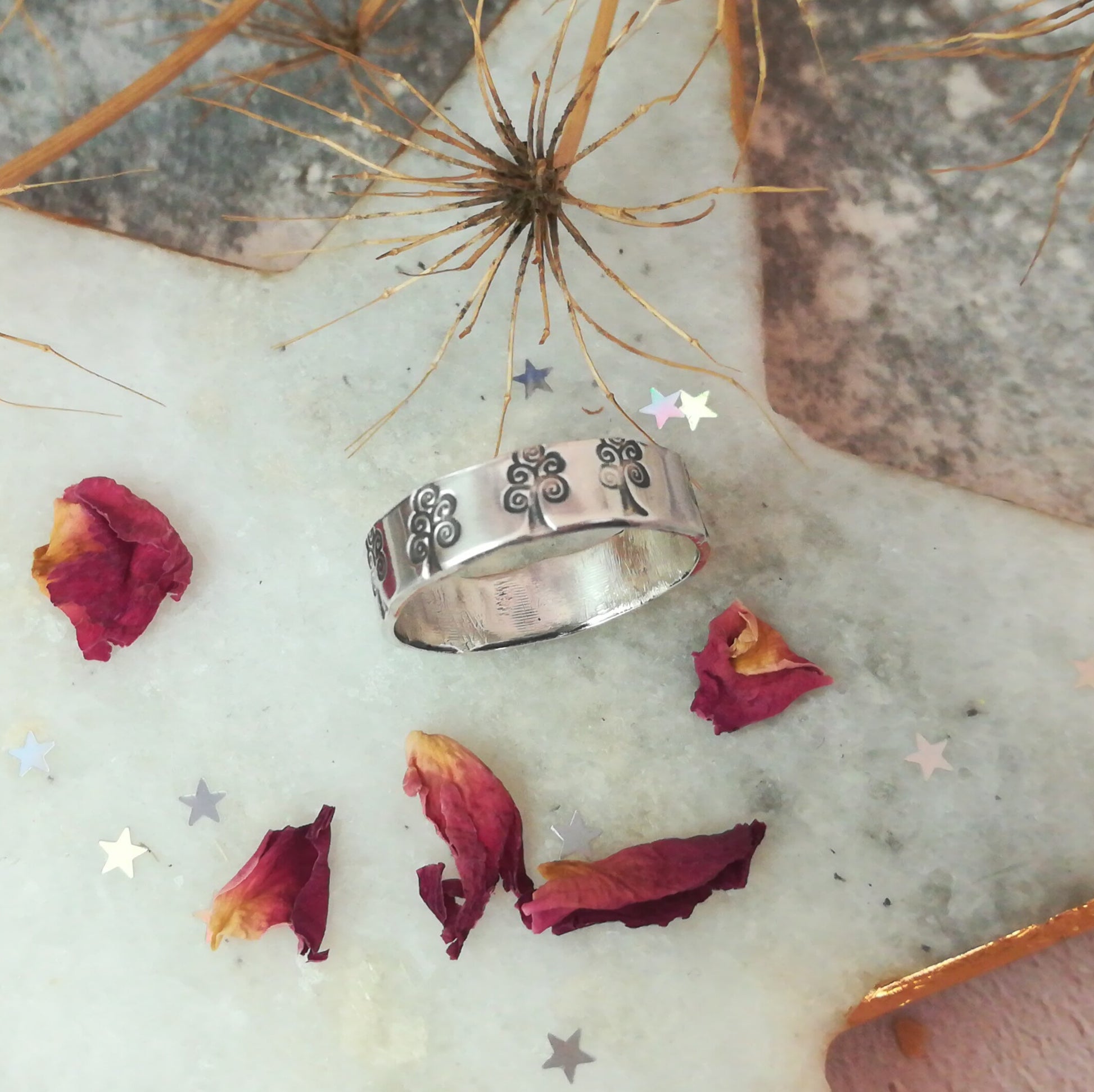 Simple and stunning swirly tree vegan handstamped band ring. The band measures 4mm wide. This is made to your size from 100% recycled sterling silver.