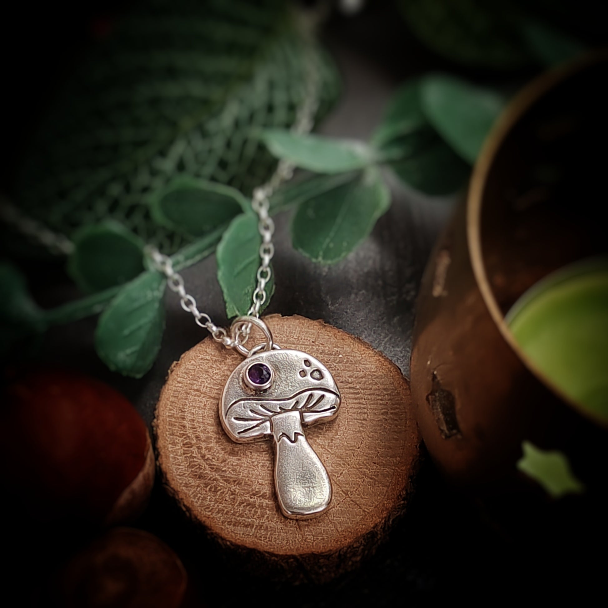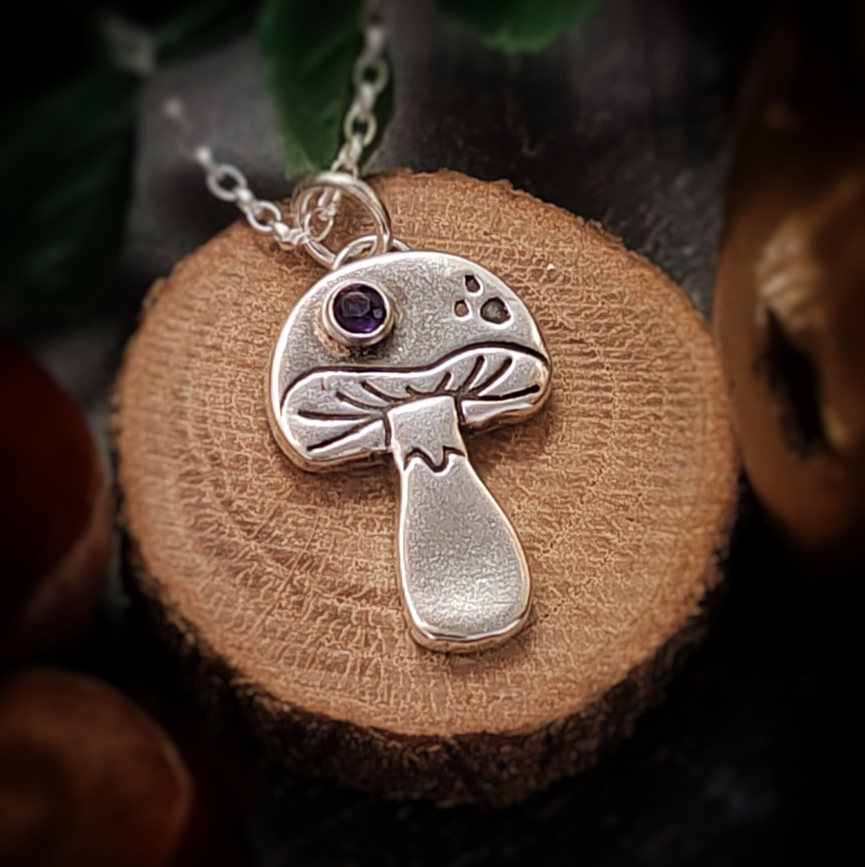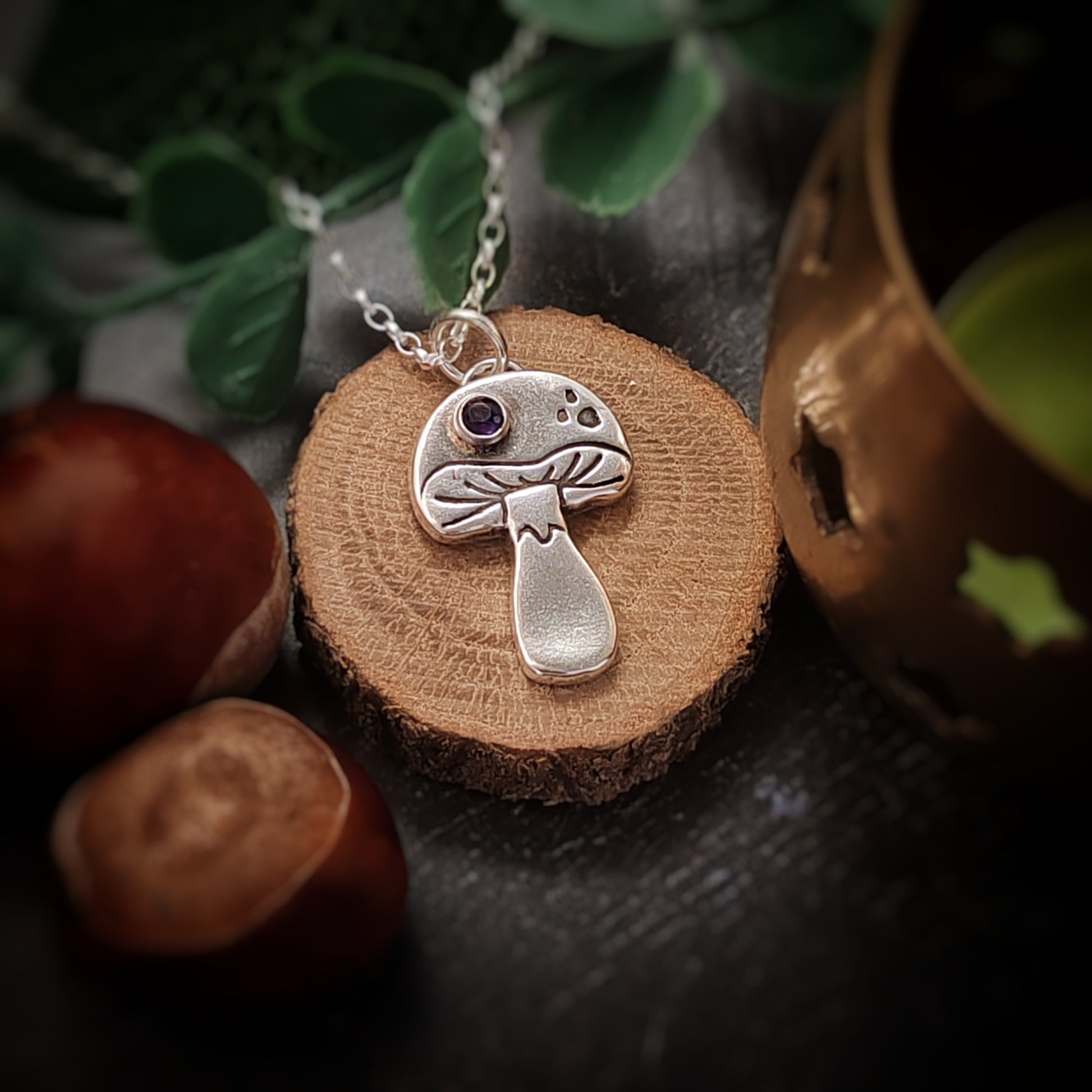 Stunning toadstool necklace. This magical toadstool pendant is made from recycled silver and adorned with a sparkly 3mm purple amethyst gemstone.