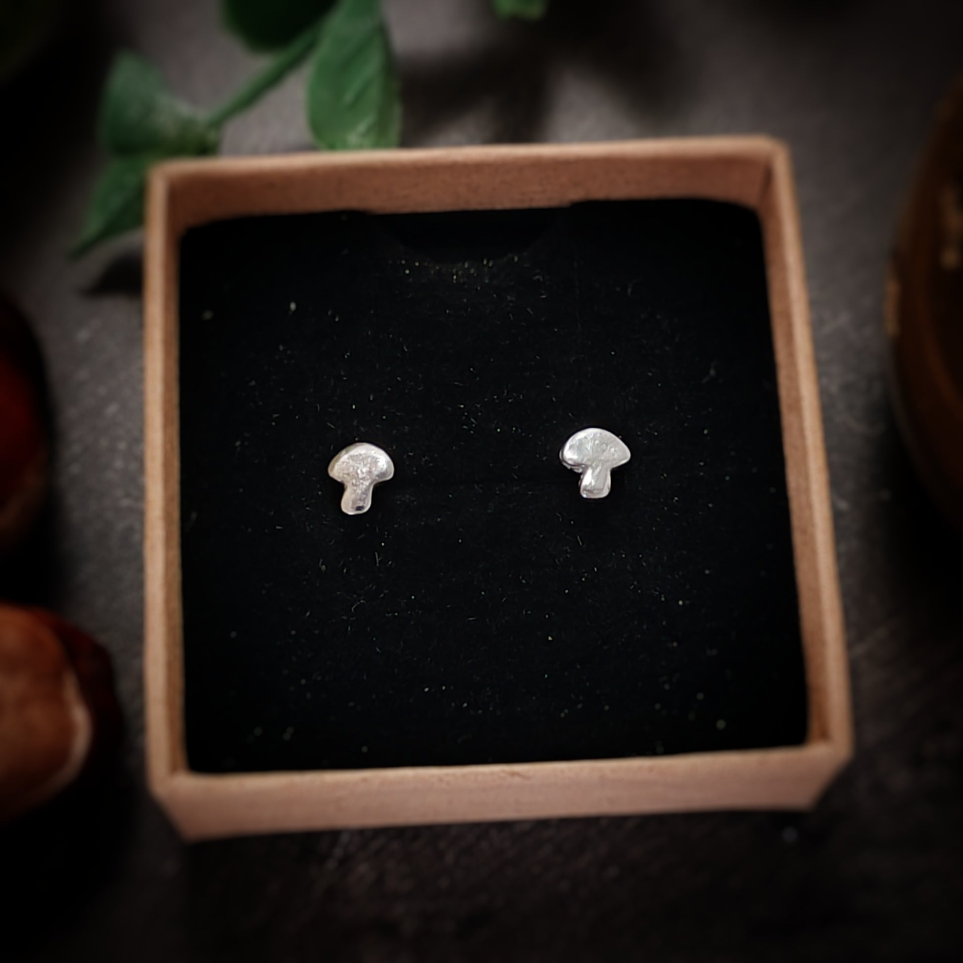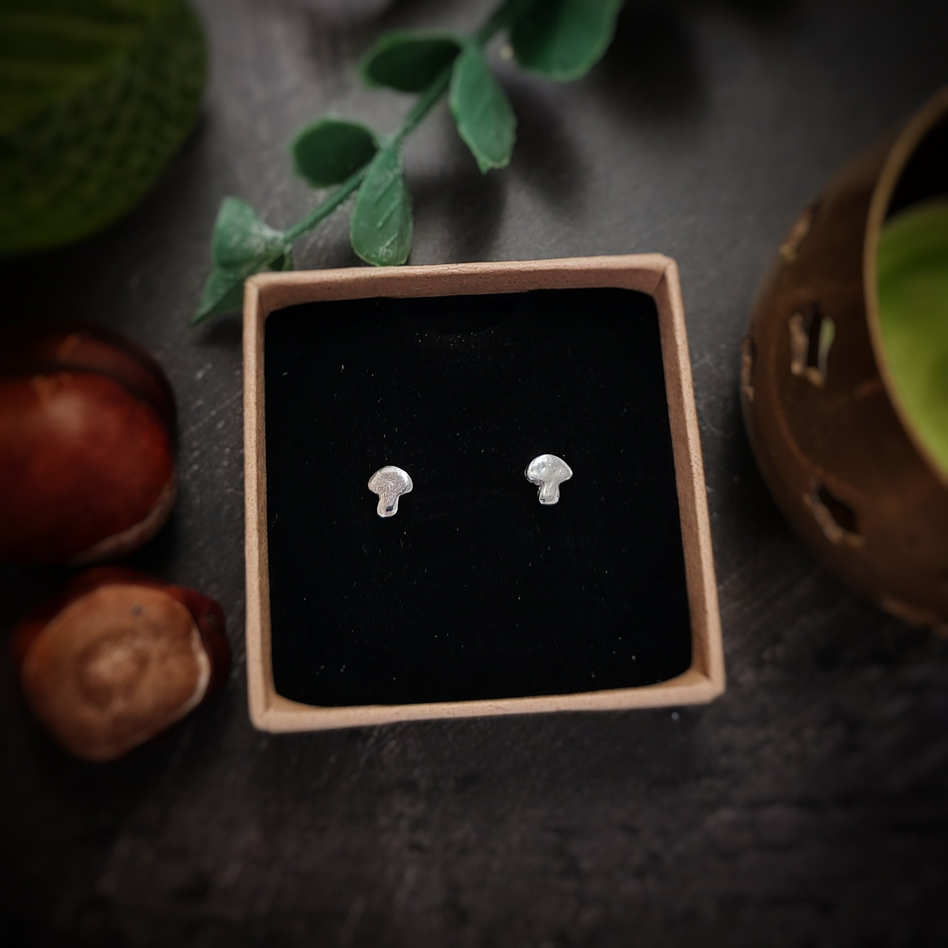 Stunning recycled silver toadstool stud earrings. These dainty studs measure appropriately 6mm tall. They are suitable for pierced ears and come with a push on butterfly back.