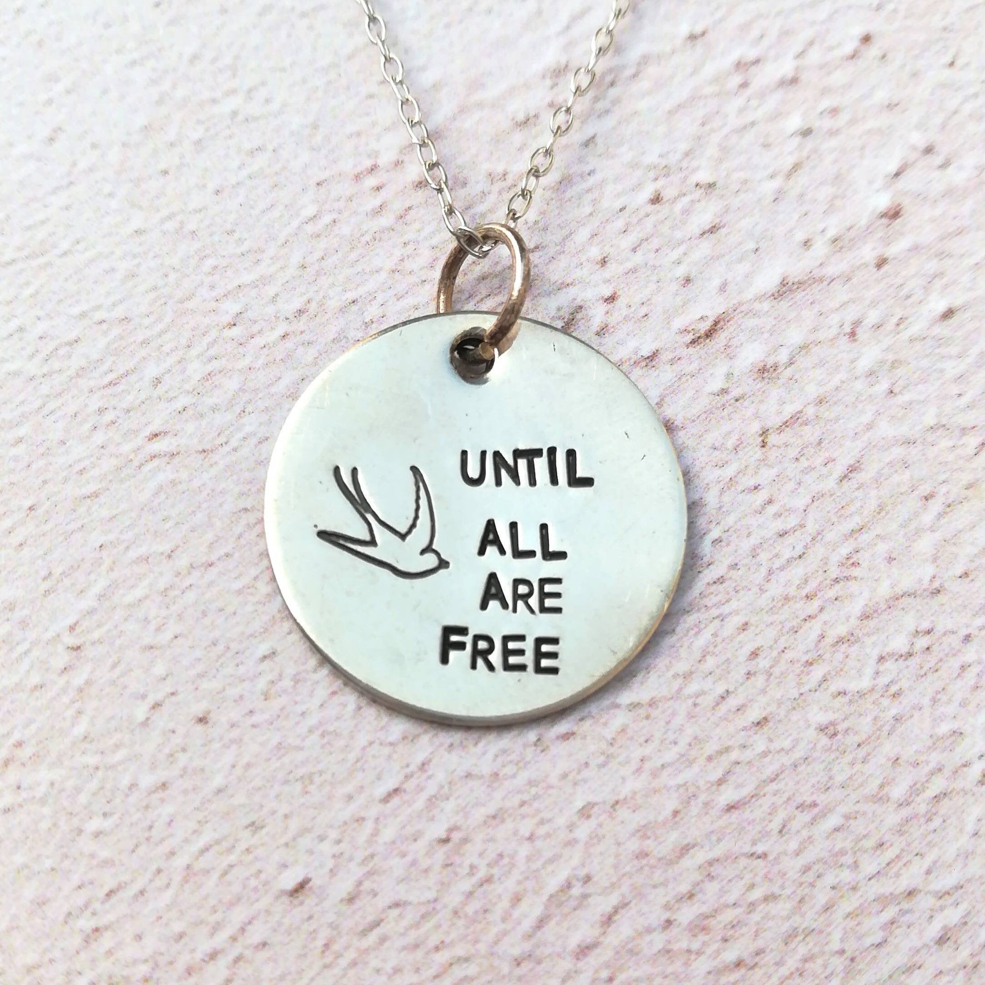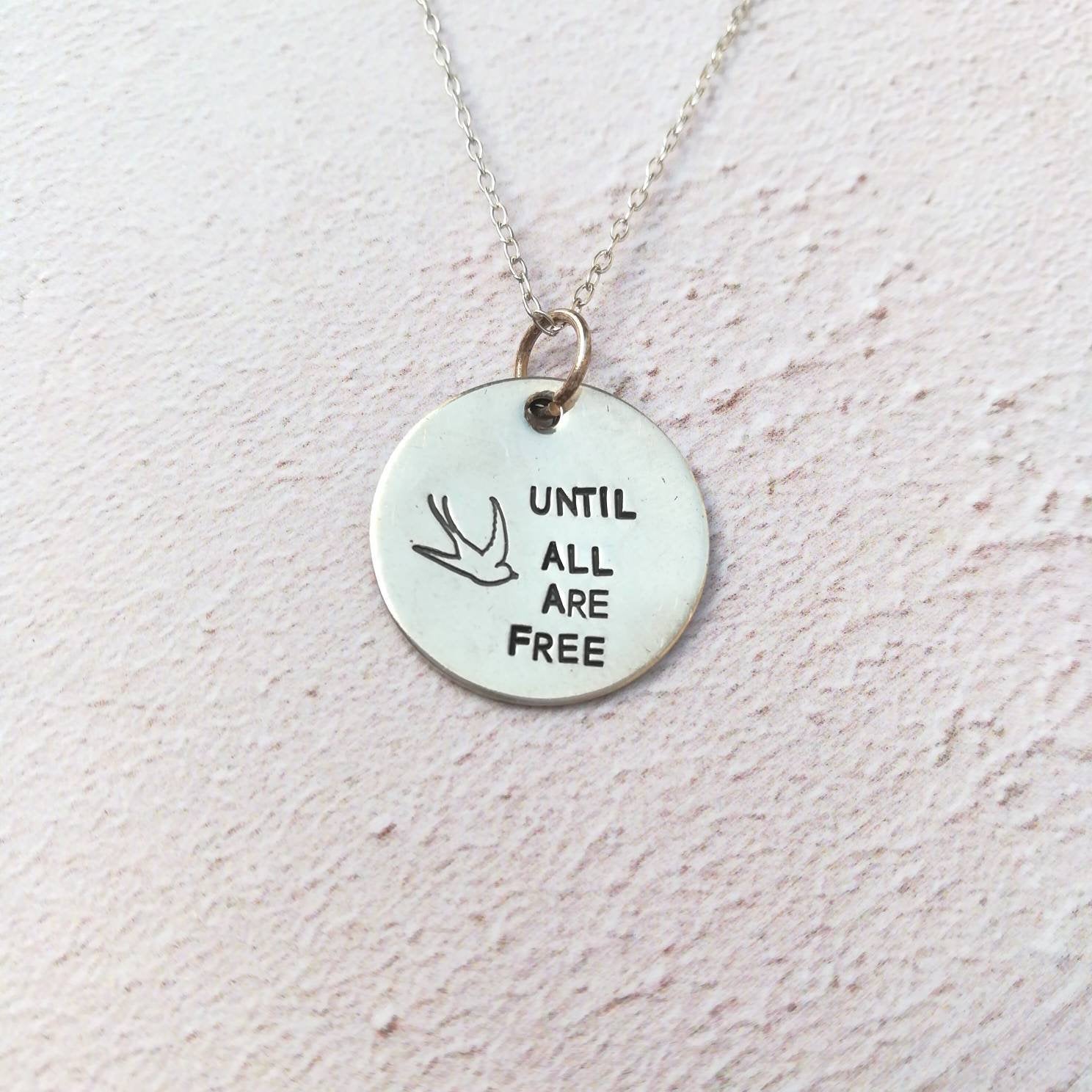 Gorgeous vegan message necklace featuring a handstamped 21mm pendant with a soaring bird image with "until all are free" stamped into it. Both the pendant and chain are made from 100% recycled, eco friendly sterling silver. The chain measures 18". This is one of my most popular designs and one I am most proud of. I think this is such an important message and hopefully will be a conversation starter where you can spread the word about veganism and animal rights. You will receive a necklace which has been made just for you. I accept custom requests so if you would like a necklace which says something else just send me a convo and we can discuss options. We are a 100% vegan business.