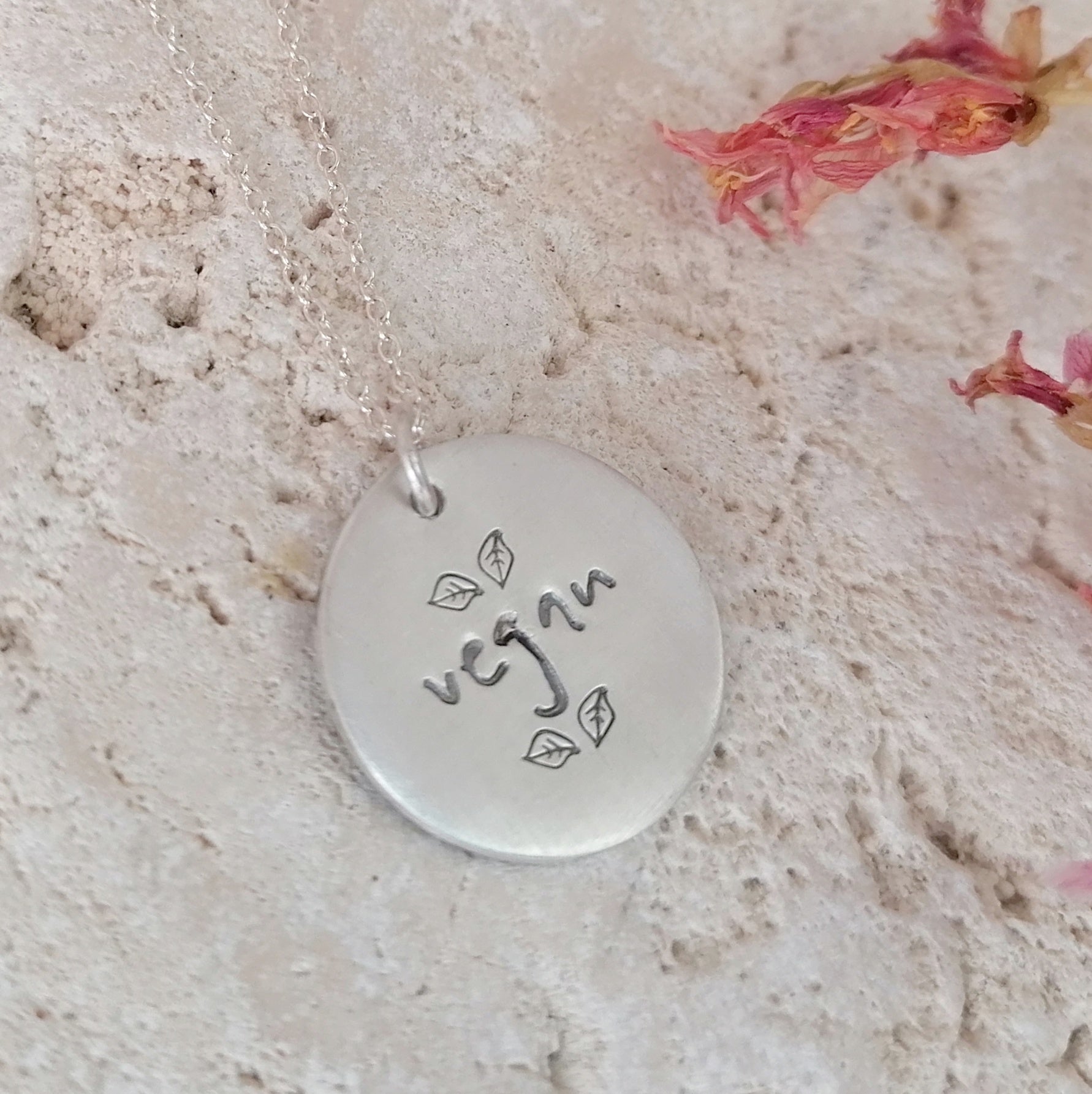 Gorgeous vegan leaf necklace made from recycled sterling silver. This lovely pendant is hand stamped with the word vegan in a lovely handwriting font accompanied by four leaves. The pendant measures approximately 19mm and hangs from an 18" sterling silver chain.