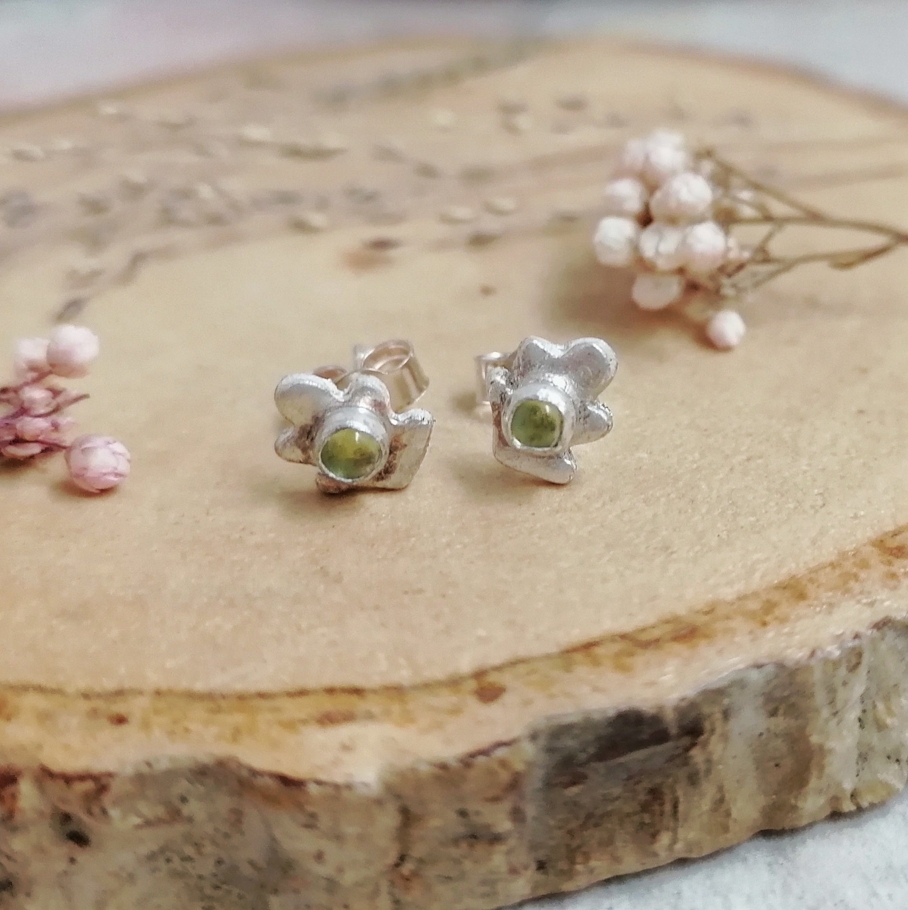 These gorgeous stud earrings are wavy leaf shaped with a beautiful peridot gemstone.