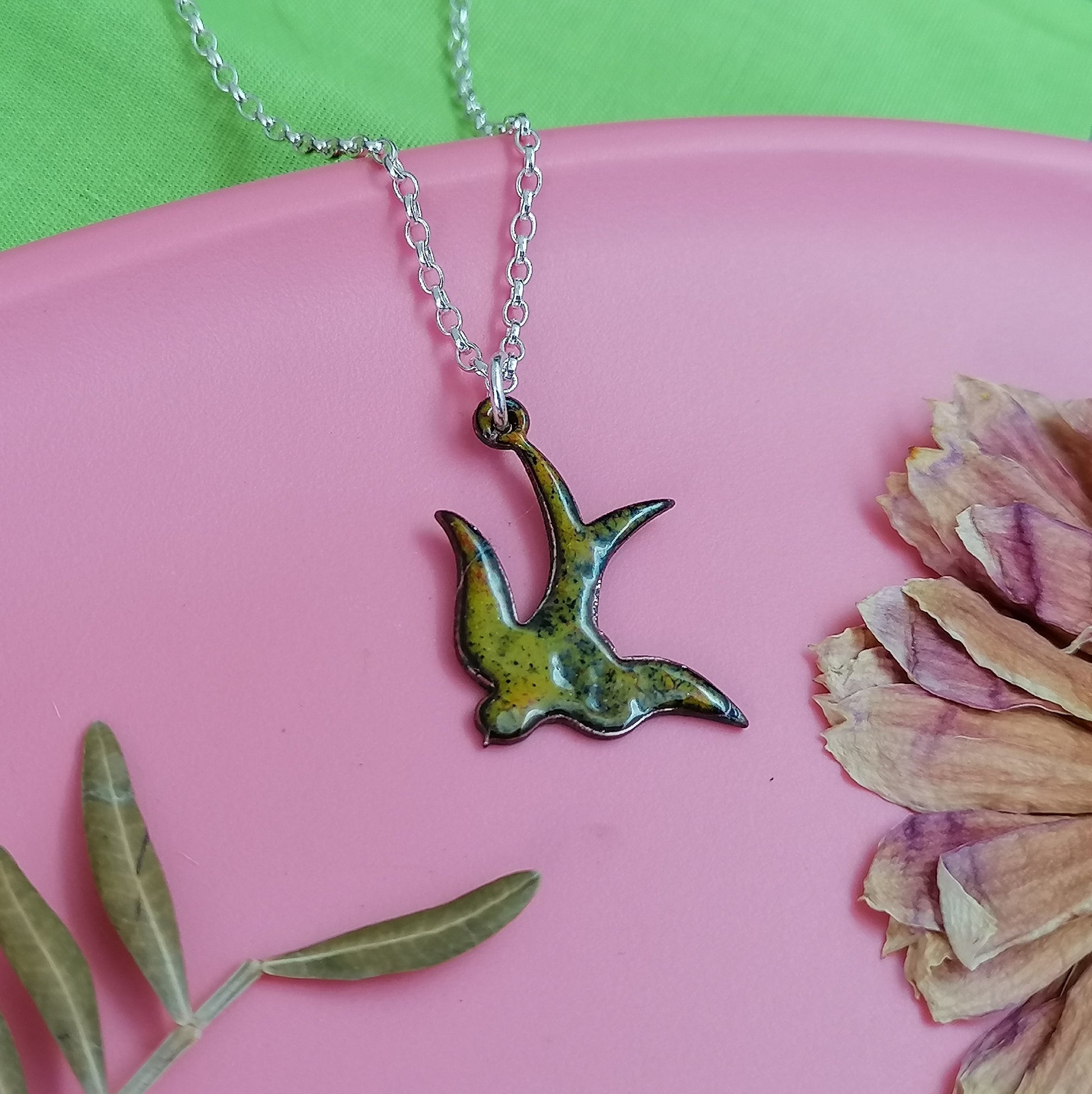 Stunning yellow bird necklace created by layering enamel. The bird is made from copper and enamelled on both sides meaning the copper will not be touching your skin. This beautiful one of a kind pendant hangs from a pretty 18" sterling silver belcher chain.