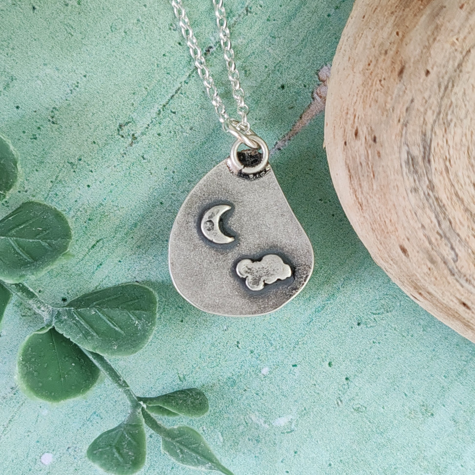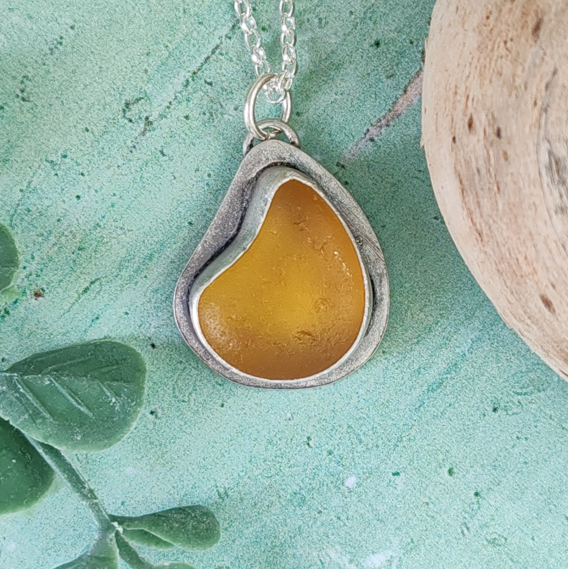 I found this beautiful piece of sea glass on the North Yorkshire coast. Yellow is quite a rare colour to find so this is a really special piece! It is set in a wonderfully organic shaped setting and I have added a little secret on the back to make it extra special. The delicate little moon and cloud are made from recycled silver and add a beautiful dynamic to the pendant. The silver is finished in a beautiful matte look.