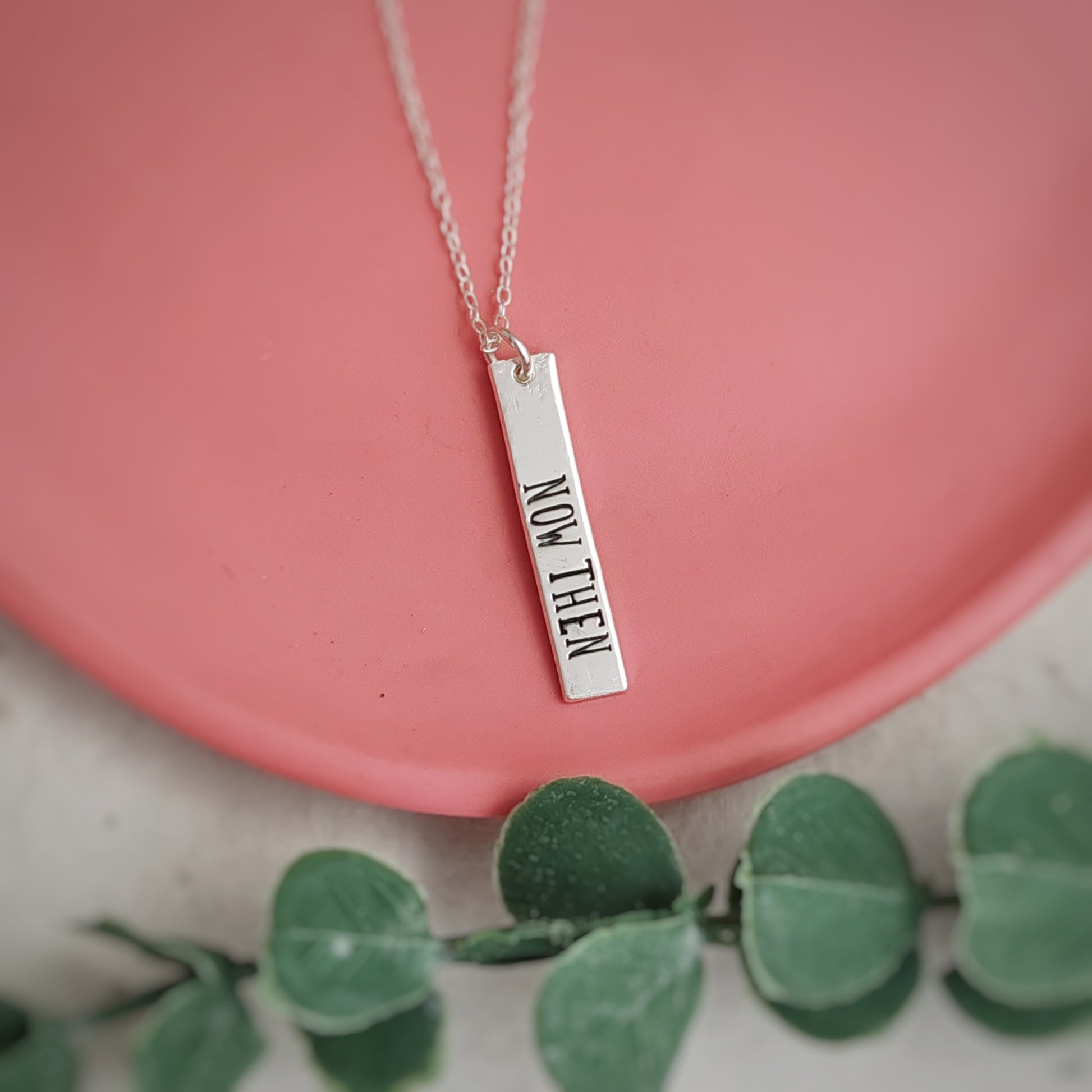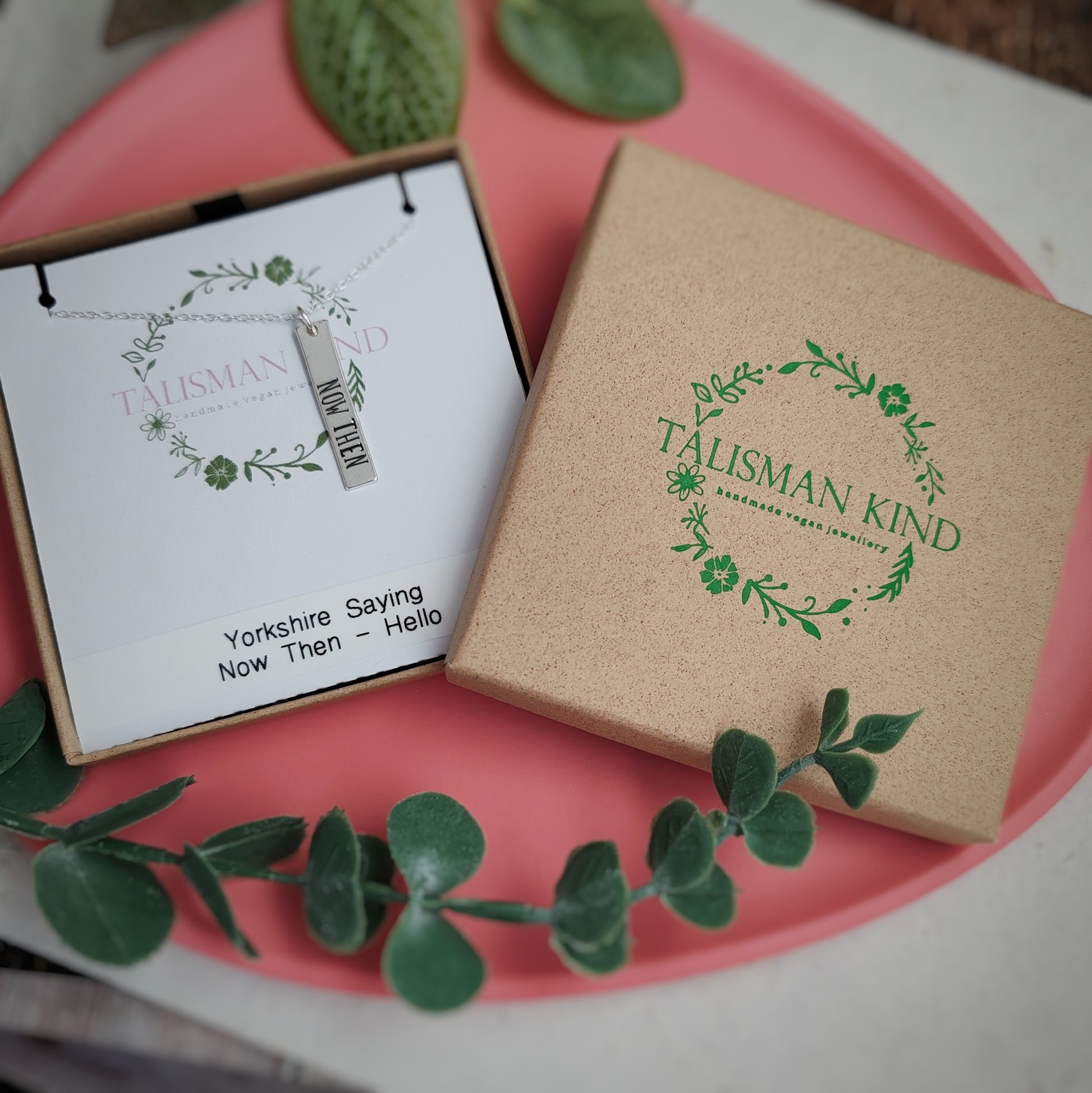 Our Yorkshire Sayings necklaces are made from recycled sterling silver and come on an 18" sterling silver chain. The pendants are created from the off-cuts of our ring making process so each one is a unique length and no two will be the same. They will all be 5mm width. The sayings are carefully hammered by hand into the metal one letter at a time.