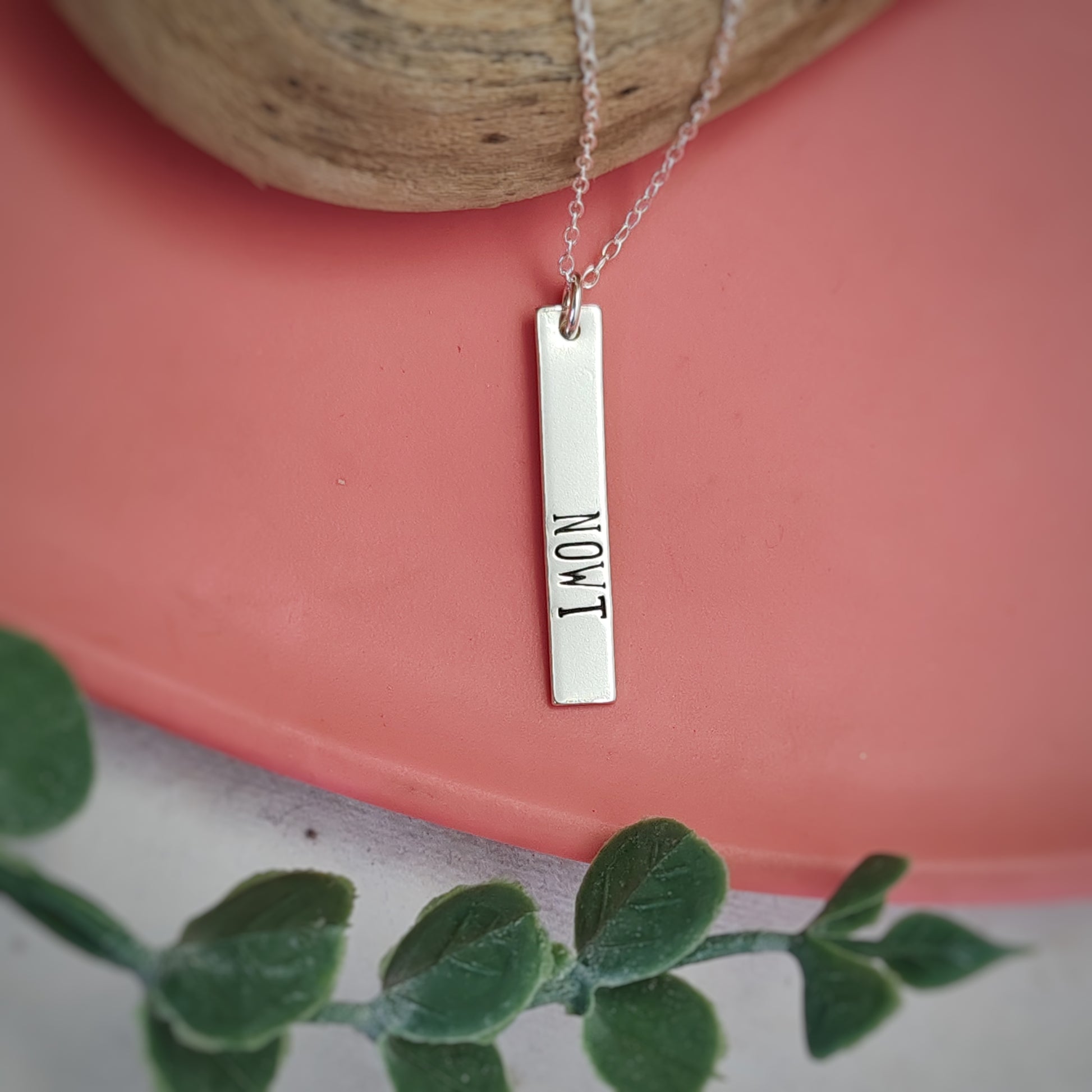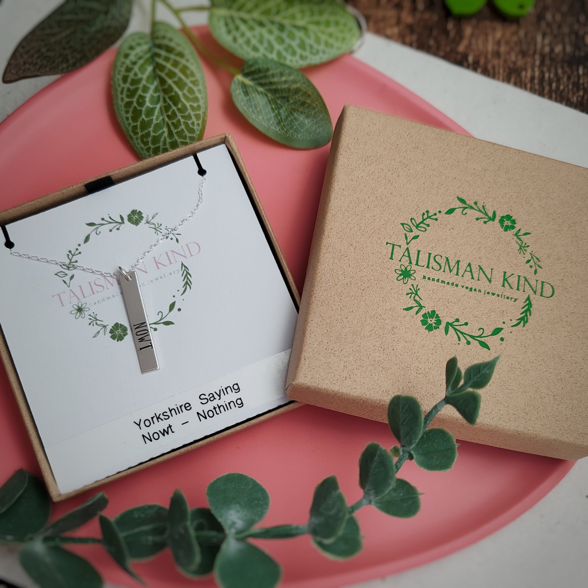 Our Yorkshire Sayings necklaces are made from recycled sterling silver and come on an 18" sterling silver chain. The pendants are created from the off-cuts of our ring making process so each one is a unique length and no two will be the same. They will all be 5mm width. The sayings are carefully hammered by hand into the metal one letter at a time.