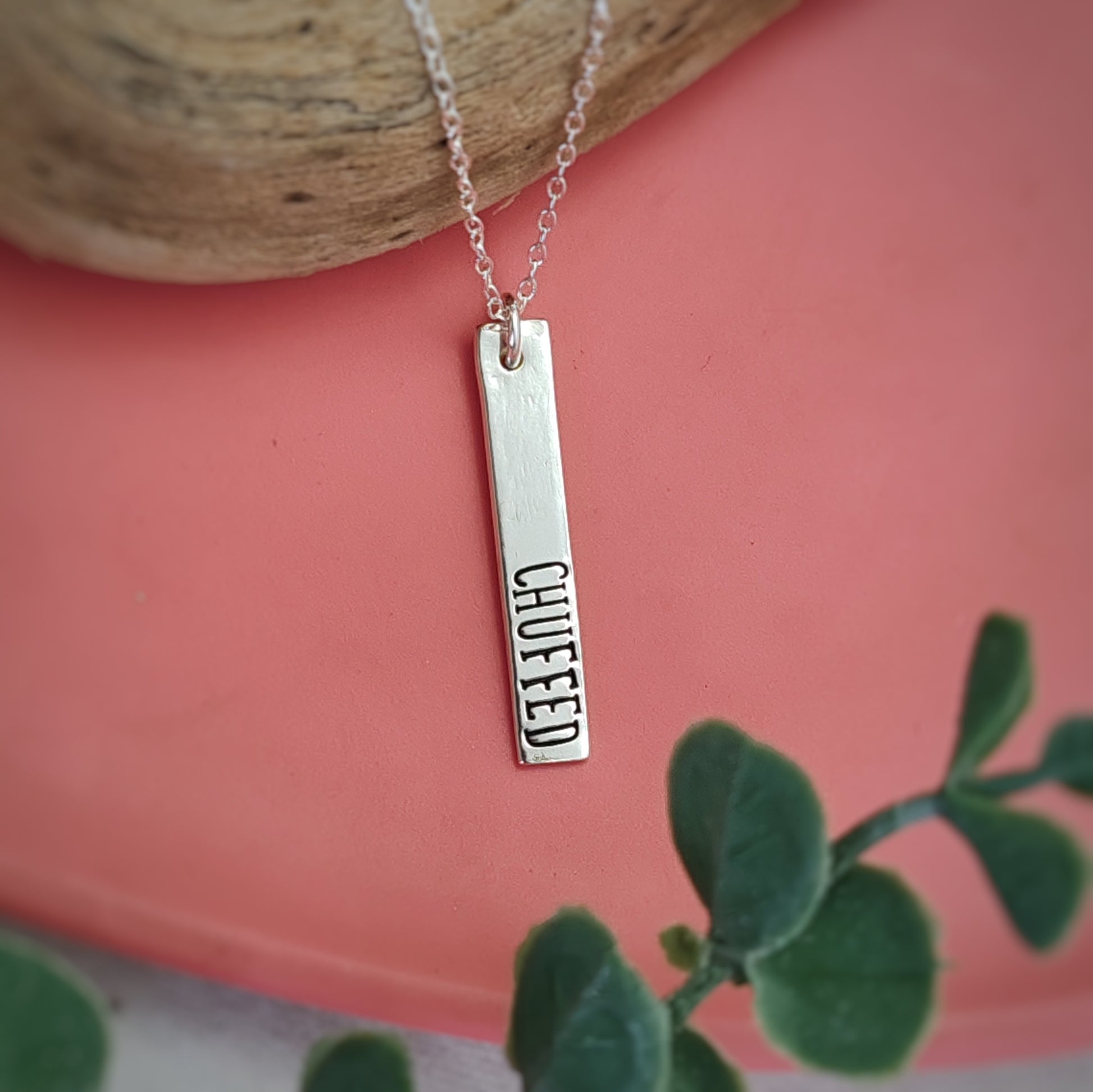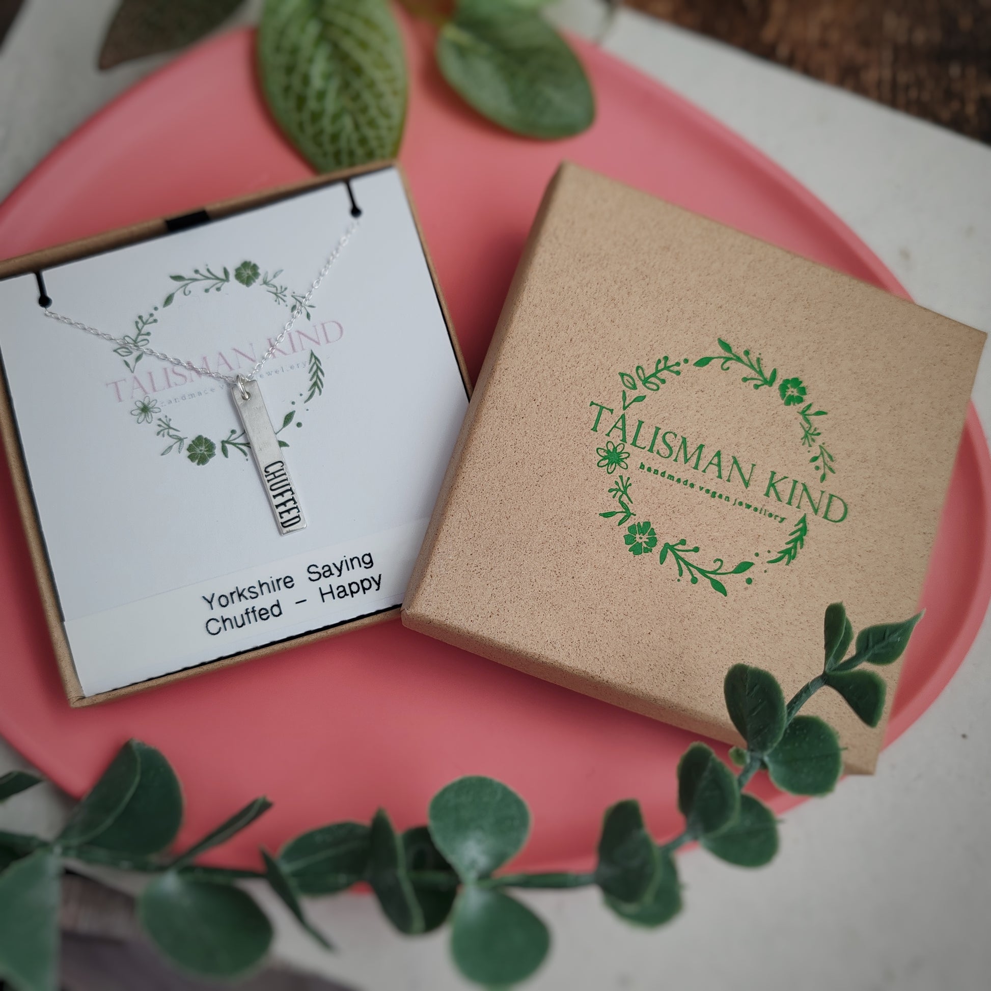Our Yorkshire Sayings necklaces are made from recycled sterling silver and come on an 18" sterling silver chain. The pendants are created from the off-cuts of our ring making process so each one is a unique length and no two will be the same. They will all be 5mm width. The sayings are carefully hammered by hand into the metal one letter at a time.