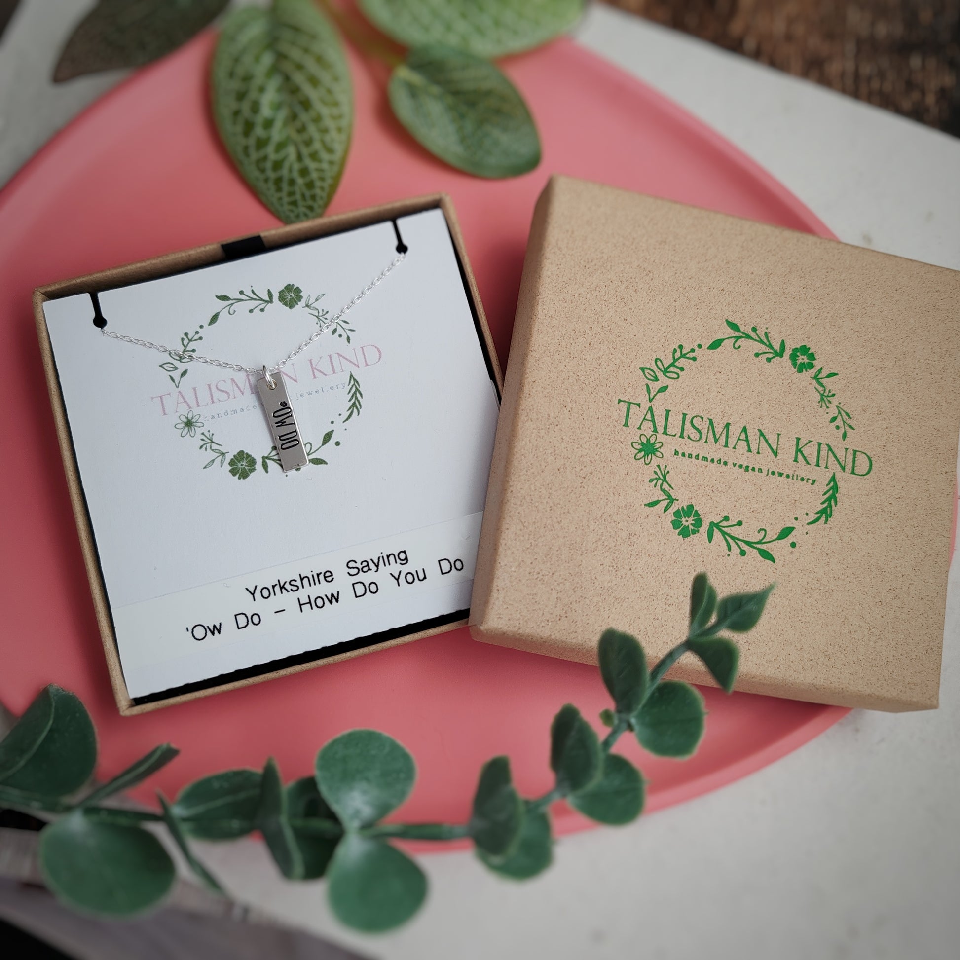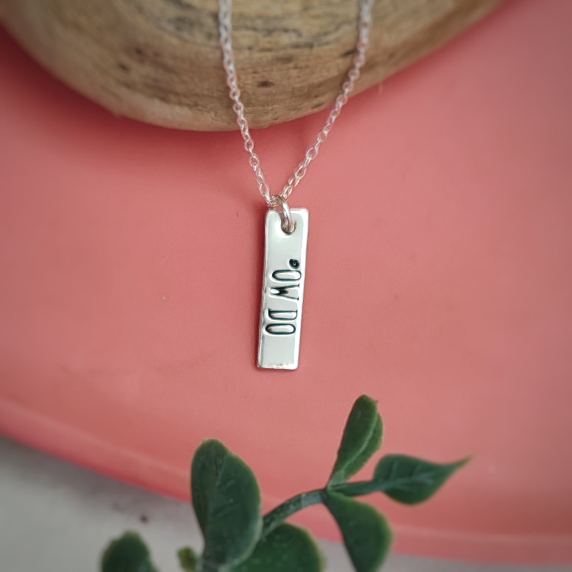Our Yorkshire Sayings necklaces are made from recycled sterling silver and come on an 18" sterling silver chain. The pendants are created from the off-cuts of our ring making process so each one is a unique length and no two will be the same. They will all be 5mm width. The sayings are carefully hammered by hand into the metal one letter at a time.