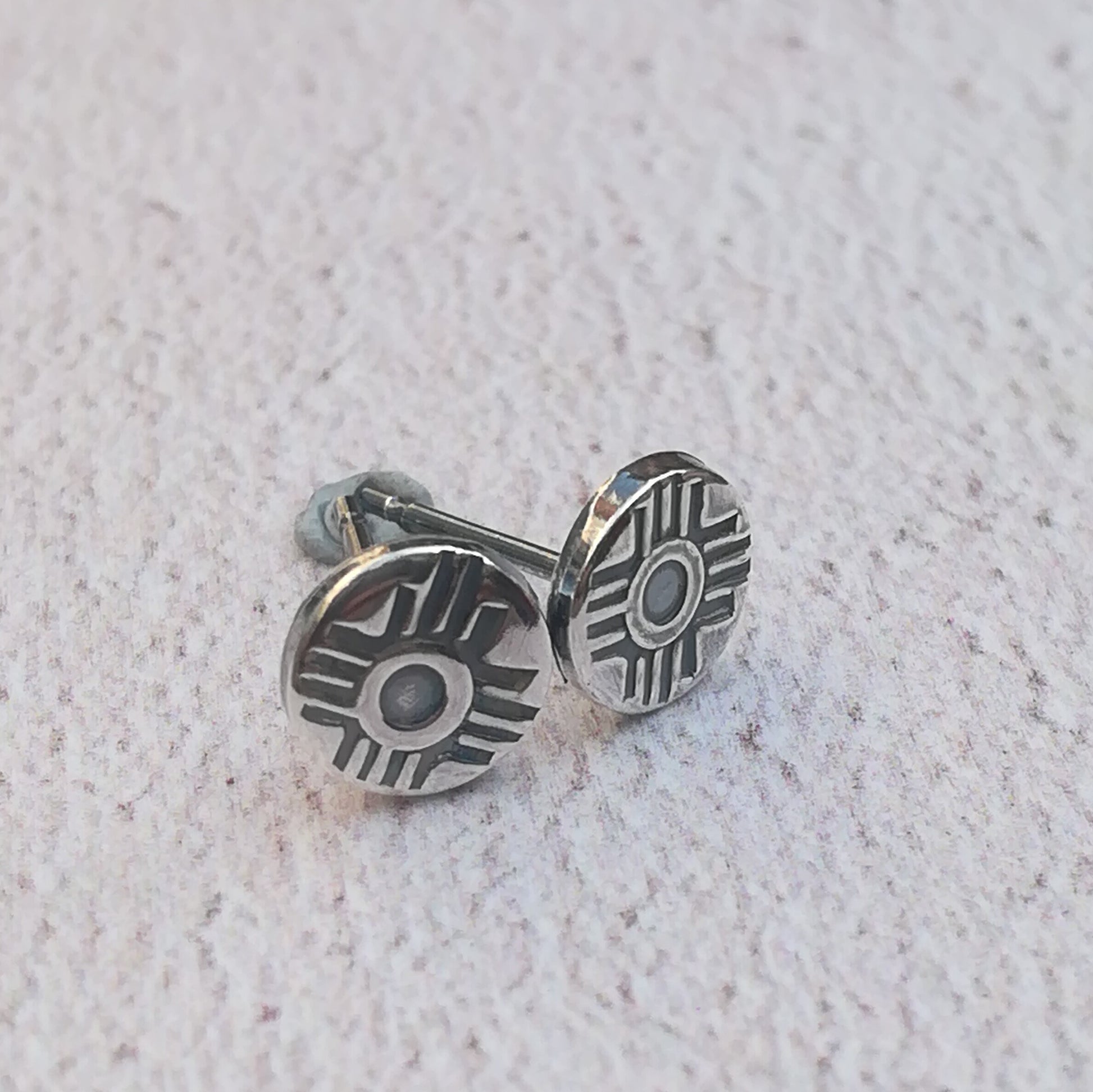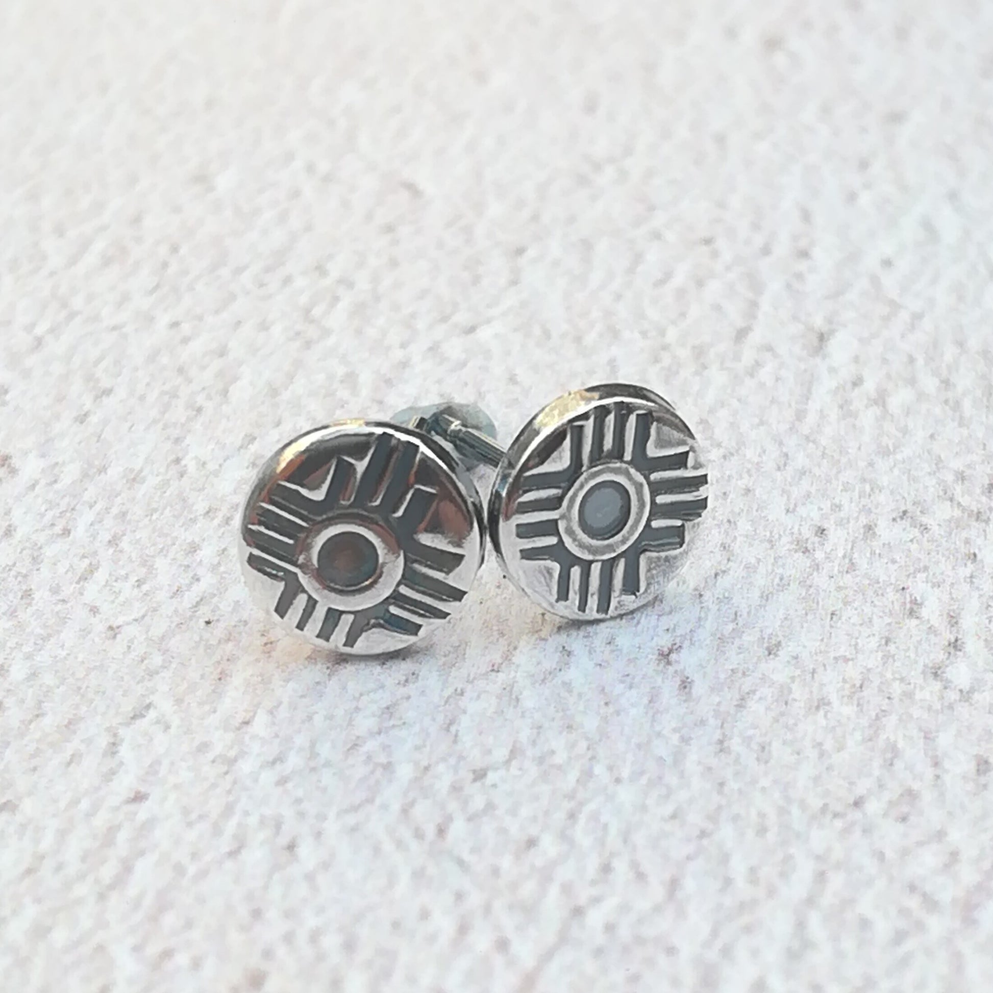 Pretty hand stamped sterling silver Zia stud earrings. The earrings measure 6mm in diameter and will be carefully hand stamped using traditional handmade navajo metal stamps. Your earrings will be made just for you. They are suitable for pierced ears and will come with sterling silver scroll backs. We are a 100% vegan business.